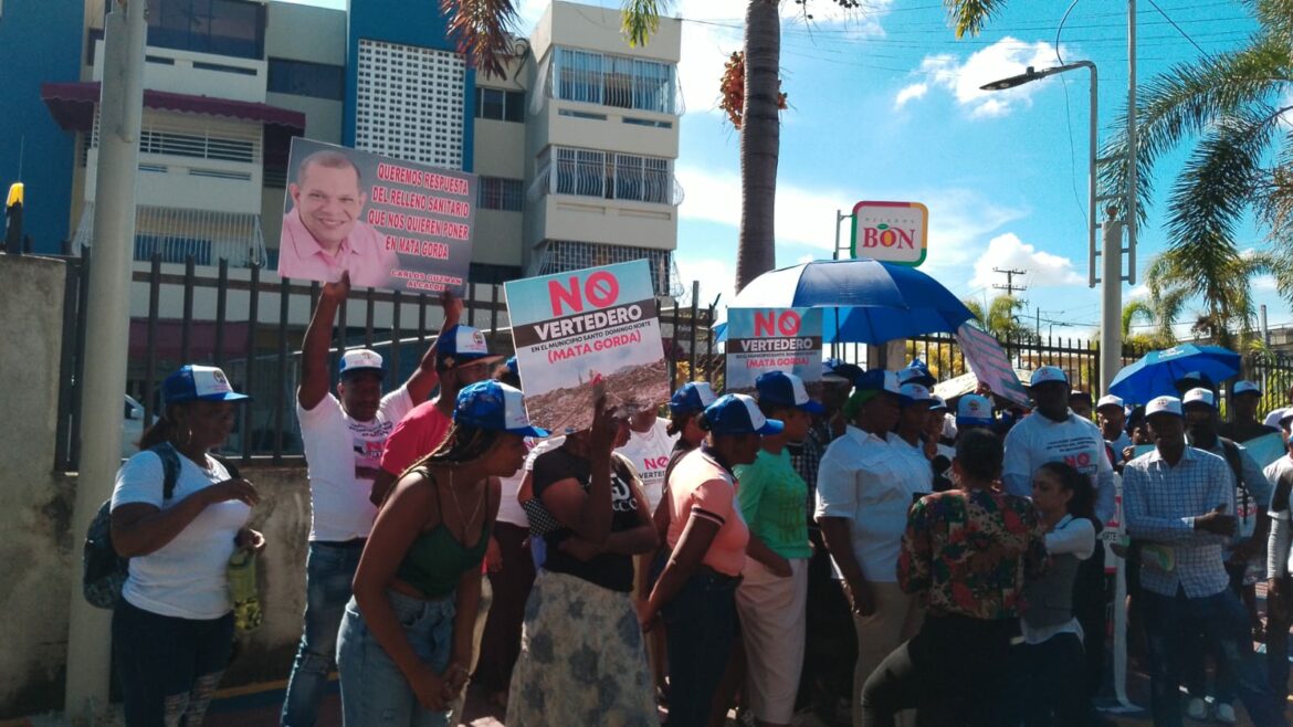 Santo Domingo. -Decenas de personas realizaron una protesta frente al Ayuntamiento de Santo Domingo Norte en demanda de que ese cabildo y sus autoridades desistan supuestamente de apoyar a un grupo de empresarios que buscan instalar un relleno sanitario en su sector Mata Gorda.
