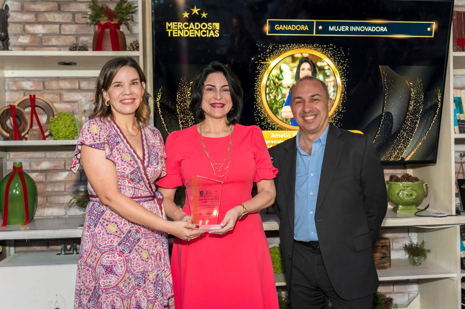 El gerente general de Connecta B2B, Marcelo Burman, y Geizel Torres, country manager de Mercados & Tendencias República Dominicana, entregaron la placa de reconocimiento a Reyes Mora en un desayuno celebrado en Santo Domingo.