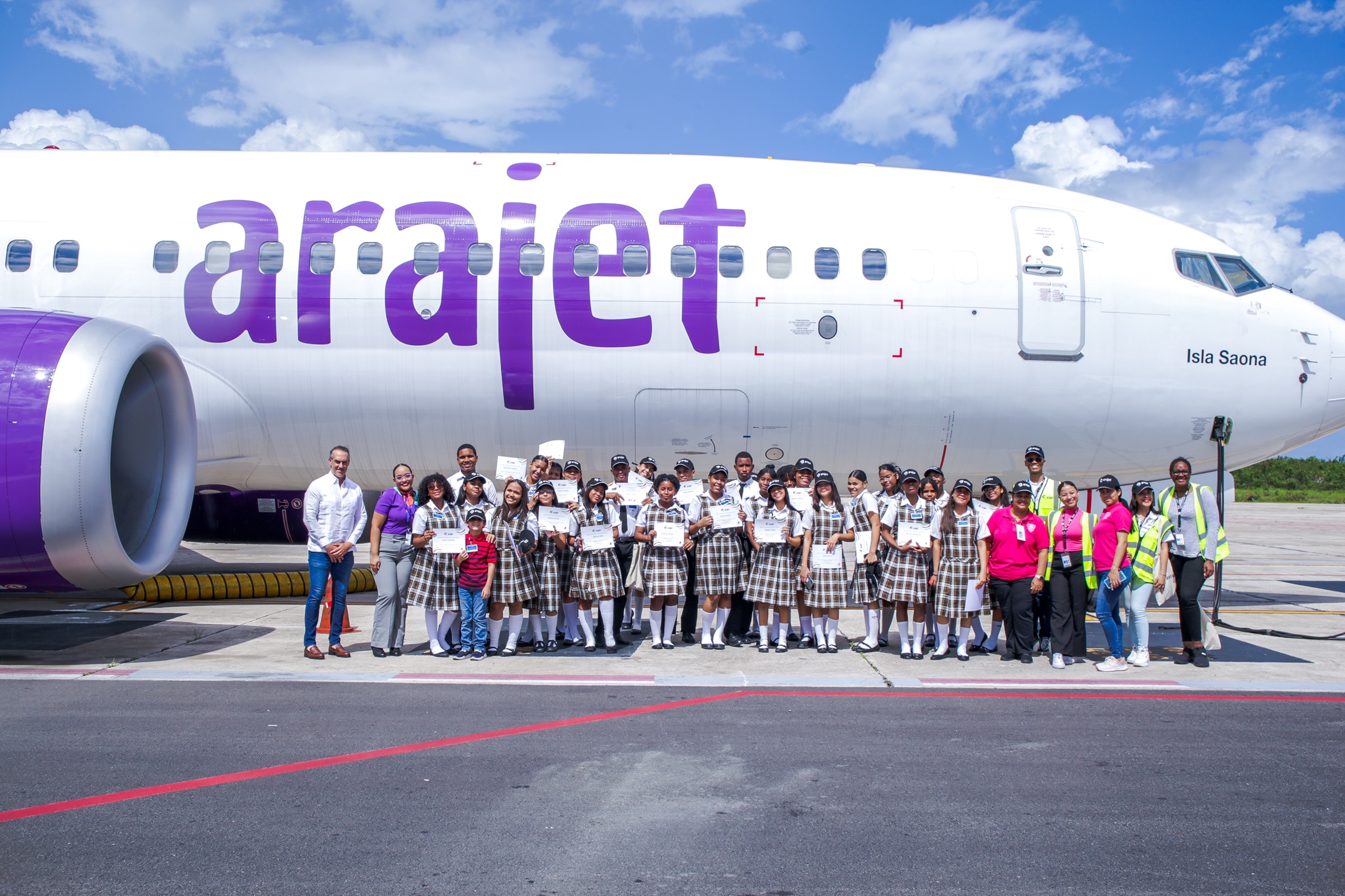 Arajet, la aerolínea de bajo costo del Caribe, recibió a más de 30 jóvenes del Instituto Politécnico Ángeles Custodios de Cristo Rey con el objetivo de despertar su interés en carreras relacionadas con la aviación y, en un futuro, formar parte de la aerolínea.