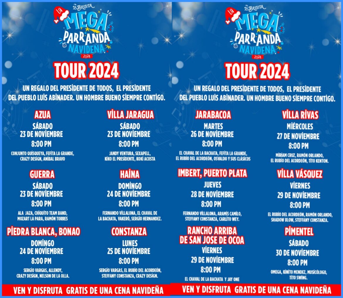 Este sábado 23 de noviembre inicia la Megaparranda Navideña 2024, el evento de entretenimiento más esperado de la temporada festiva en la República Dominicana. Con más de 35 orquestas populares y una programación que abarca distintas localidades del país, la Megaparranda busca unir a las comunidades a través de la música y la celebración navideña.
