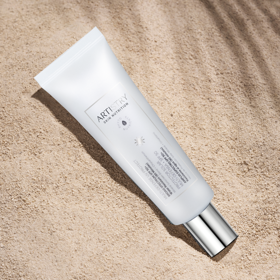 El Protector Solar Mineral Multi-Defensa FPS 50+ de Artistry Skin Nutrition™ ofrece una protección completa contra los rayos UVA/UVB, previniendo el envejecimiento prematuro de la piel y los daños causados por el sol. Además, su fórmula ligera y libre de aceite es resistente al agua hasta por 80 minutos, ideal para actividades al aire libre.