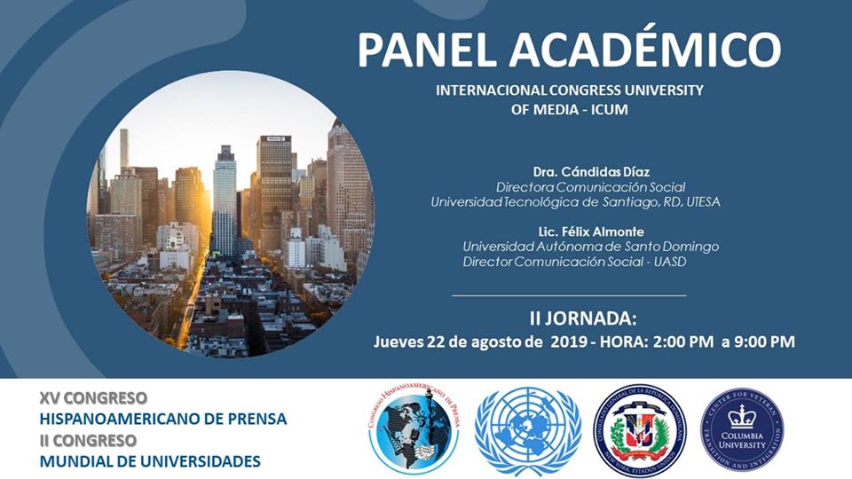 De igual manera el Dr. Cruz destaca la presencia en este XV Congreso Hispanoamericano de Prensa y II Congreso Mundial de Universidades, International Congress University of Media, (ICUM), de los panelistas catedráticos, educadores y periodistas: María Salazar Ferro, director del Committee to Protect Journalists, Roberto Domínguez, Senior Editor – Daily News, NY, el Dr. Juan Pablo Meneses Stanford University, California – The New York Time, Dra. Cándida Díaz, directora Comunicación Social – Universidad Tecnológica de Santiago, RD, UTESA, Dr. Carlos Aguasaco, City College – CUNY, Dr. Héctor Geager, Profesor Columbia y NYU University, Rectora Dra. María Elena Cruz, Universidad Tecnológica de Santiago, (Sto. Dgo.) UTESA, Dr. Vicente Alcaraz García, CB & Consultor S.L., España.