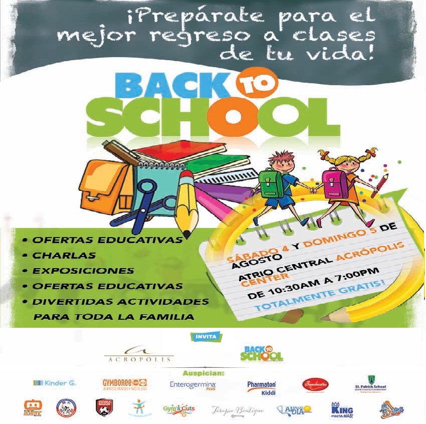 Con motivo de acercarse el regreso a clases, la Revista Back To School y Acropolis Center estarán presentando la 1ra Feria de Regreso a Clases, donde los asistentes podrán encontrar animación, ofertas educativas, personajes, charlas, exposiciones y divertidas actividades para toda la familia.
