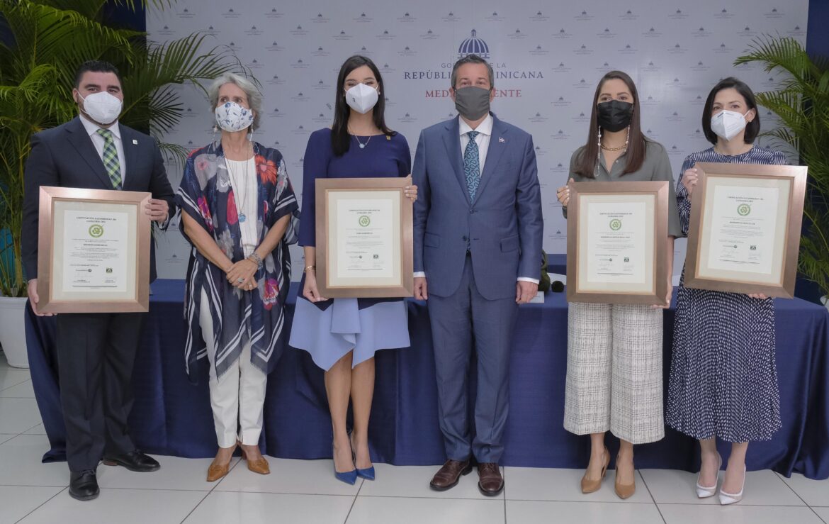 El ministro de Medio Ambiente, Orlando Jorge Mera, y Ginny Heinsen, presidenta de Sostenibilidad 3R’s, entregaron los certificados a Fraysis Moronta; directora general senior de Capital Humano, Procesos, Tecnología y Operaciones; July Mejía Capell, directora general de Capital Humano; Sabrina Andújar, directora del Voluntariado Banreservas, y Jesús González García, gerente de Salud y Seguridad Ocupacional.