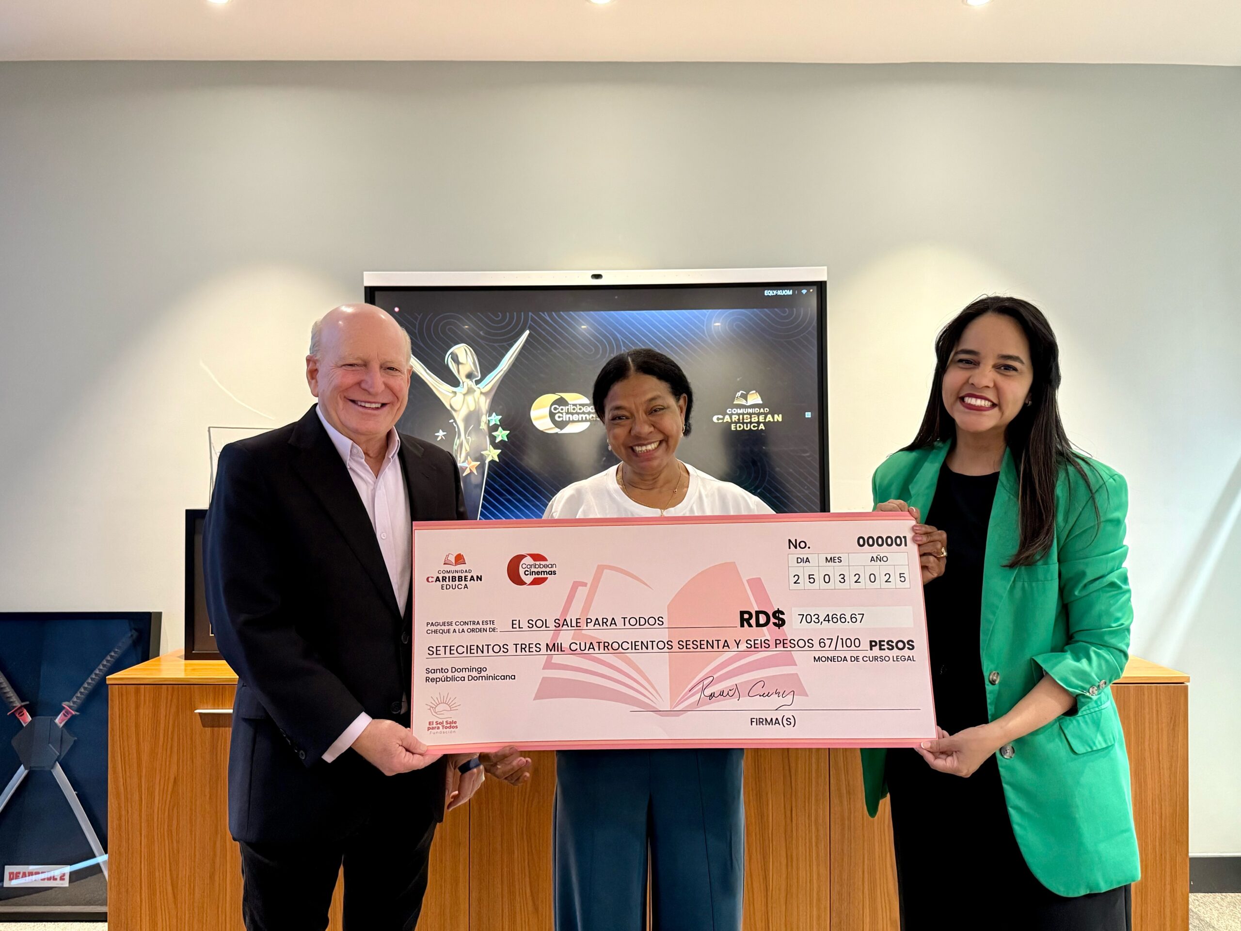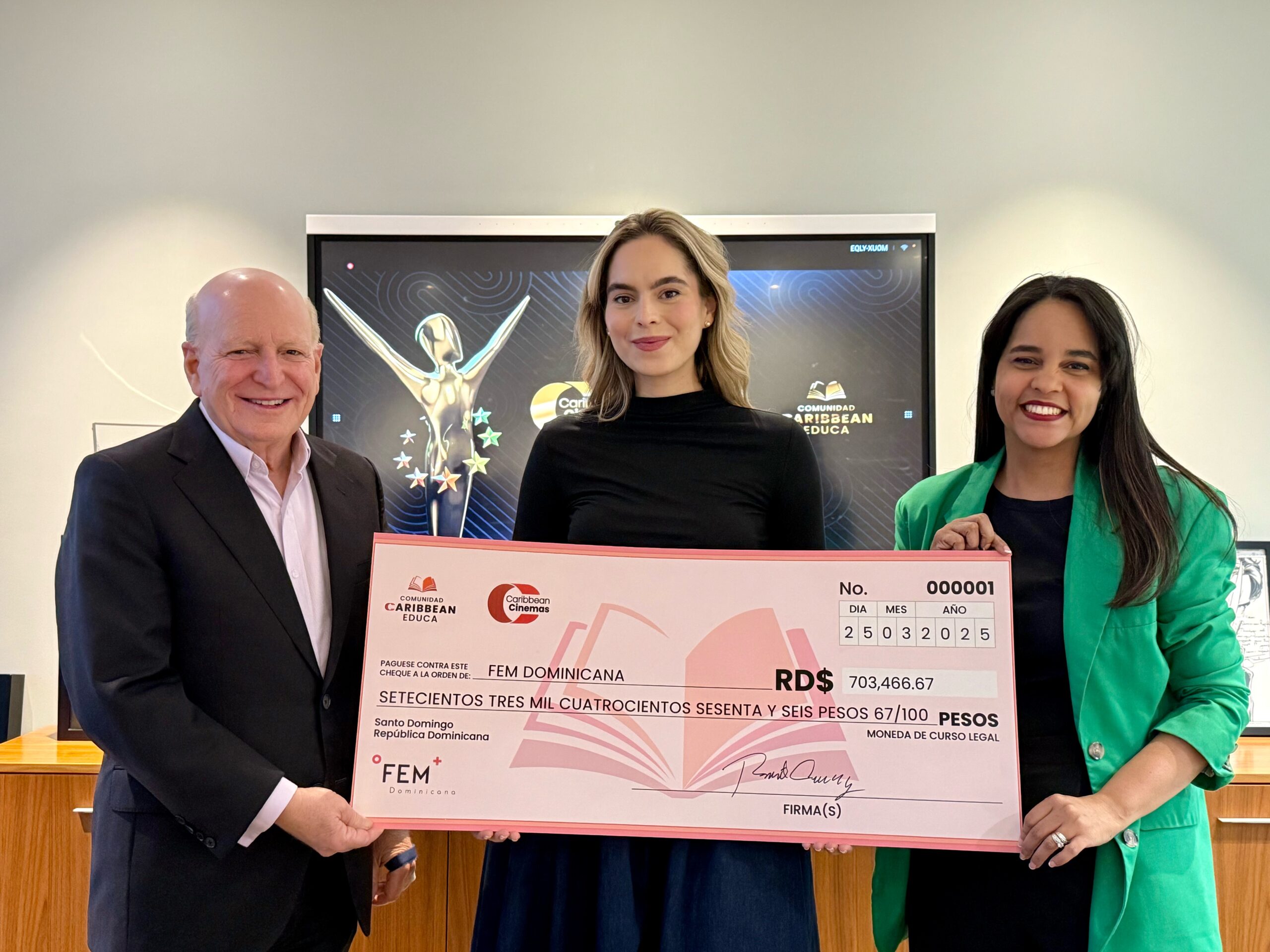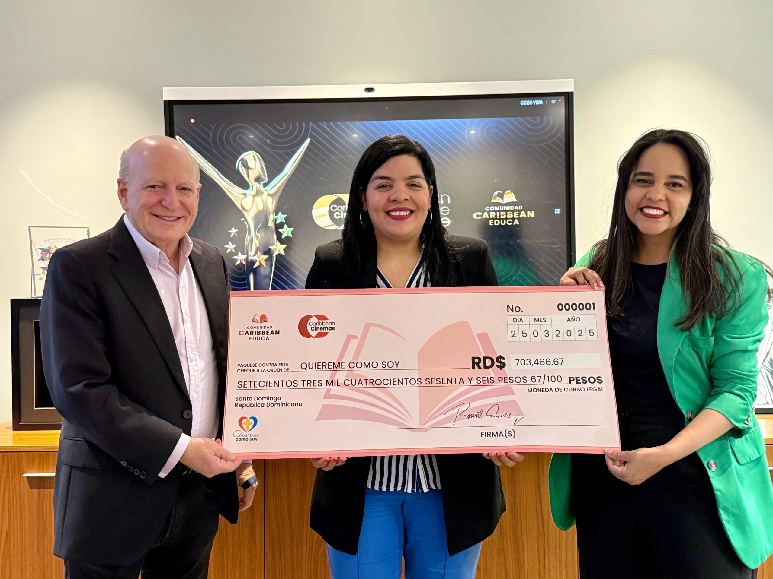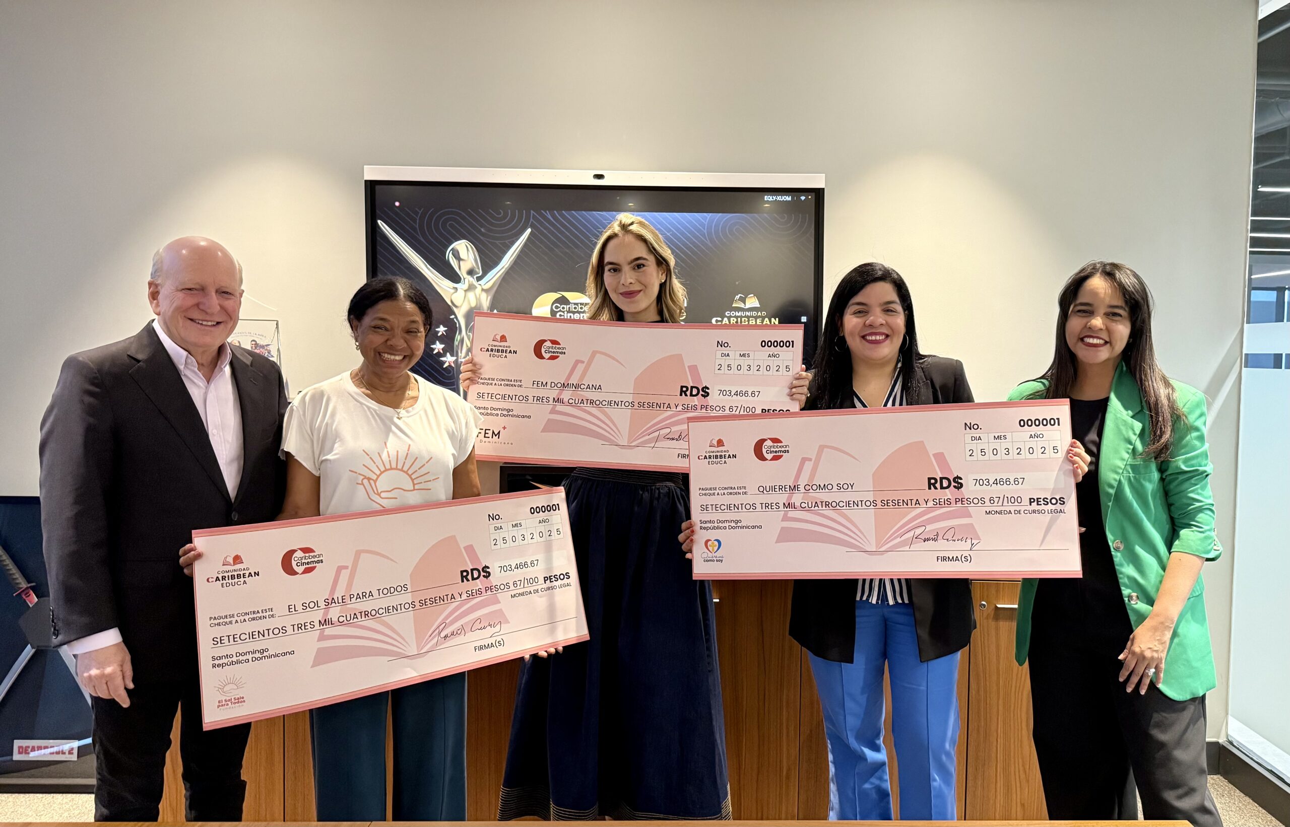 Las organizaciones beneficiadas fueron Quiéreme Como Soy, FEM Dominicana y El Sol Sale Para Todos, cada una recibiendo RD$703,466.67. La entrega fue realizada personalmente por el presidente de Caribbean Cinemas, Sr. Robert Carrady, quien reafirmó el compromiso de la empresa con el bienestar social y el desarrollo humano sostenible.