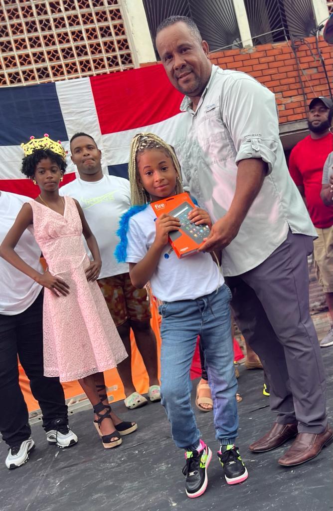 Cristian Pimentel, presidente del Consejo de Desarrollo Barrial de Villa Francisca, premió con tabletas a las cinco finalistas de la Reina del Carnaval Infantil Villa Francisca 2022 .