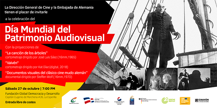 La Embajada de Alemania en Santo Domingo y la Dirección General de Cine (DGCINE), a través de la Cinemateca Dominicana, con el apoyo del Festival de Cine Global Dominicano (FCGD), la Escuela de Cine de Altos de Chavón, la Delegación de la Unión Europea y el Goethe Institute, conmemoran el Día Mundial del Patrimonio Audiovisual, el sábado 27 de octubre en las instalaciones de la Fundación Global Democracia y Desarrollo (FUNGLODE).