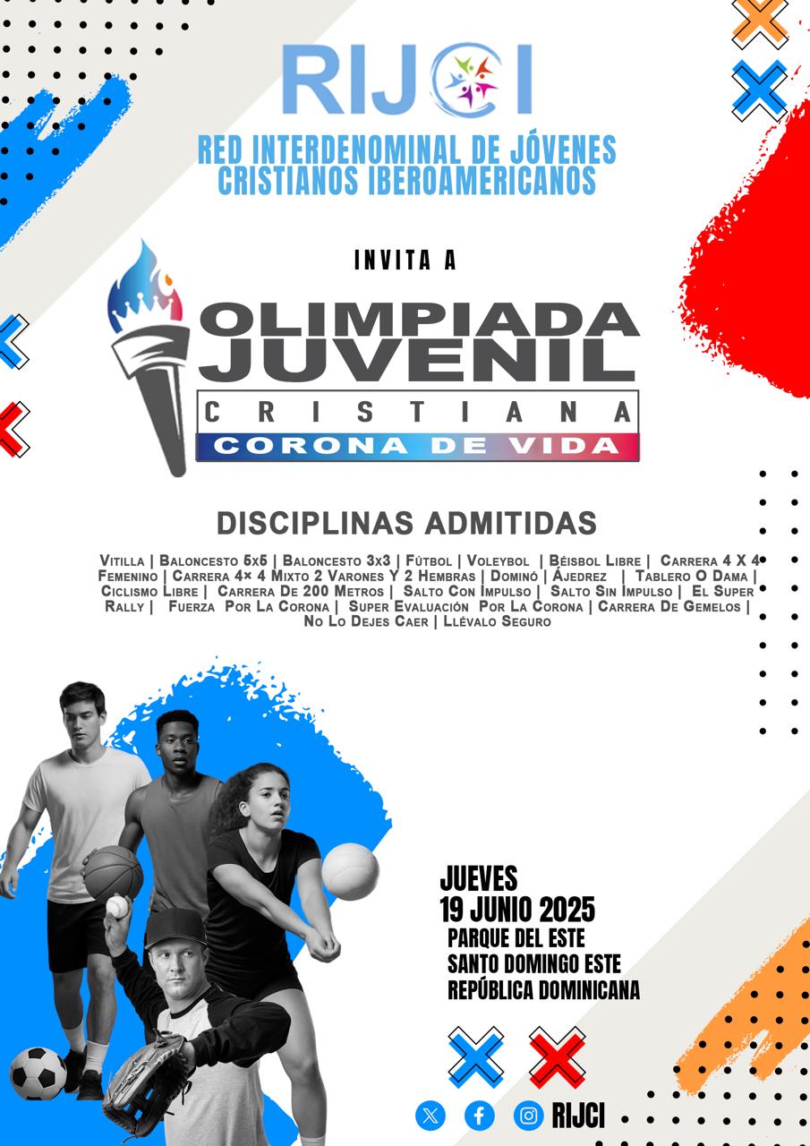 SANTO DOMINGO. – La Red Interdenominacional de Jóvenes Cristianos Iberoamericanos (RIJCI) anunció la celebración de la primera Olimpiada Juvenil Cristiana «Corona de la Vida», un evento gratuito a celebrarse el próximo jueves 19 de junio en el Parque del Este, Santo Domingo Este, una iniciativa que busca impactar positivamente a la juventud dominicana.