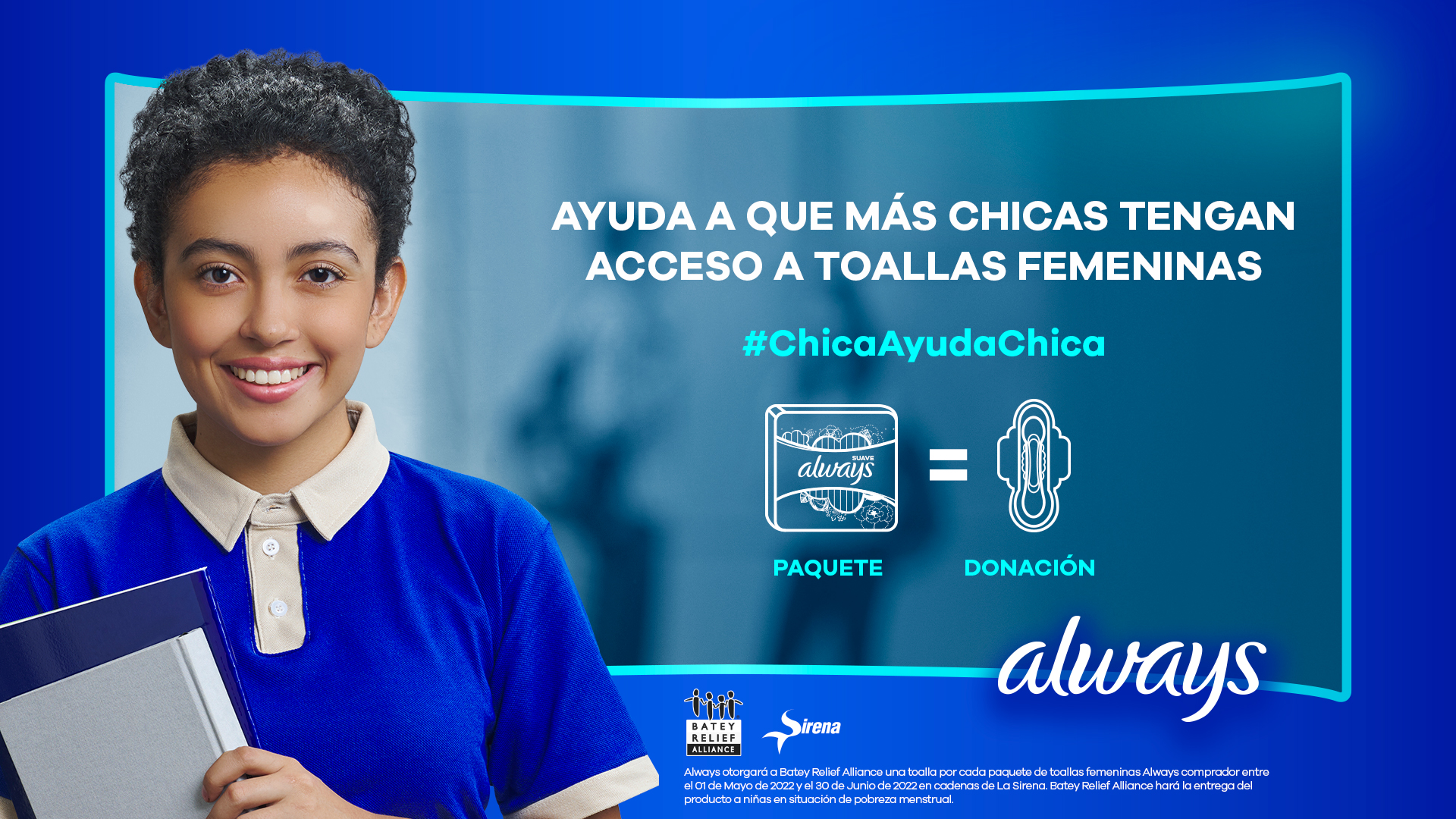 Para que algo tan natural como la menstruación no se interponga en el camino de la educación, Always suma esfuerzos con Batey Relief Alliance, continuando su compromiso de más de 35 años por defender la confianza de las niñas con la campaña #ChicaAyudaChica. Ésta tiene el objetivo de visibilizar el problema, generar conversación y ayudar, a través de la donación de un estimado de 20 mil toallas femeninas, a comunidades de escasos recursos en el país.