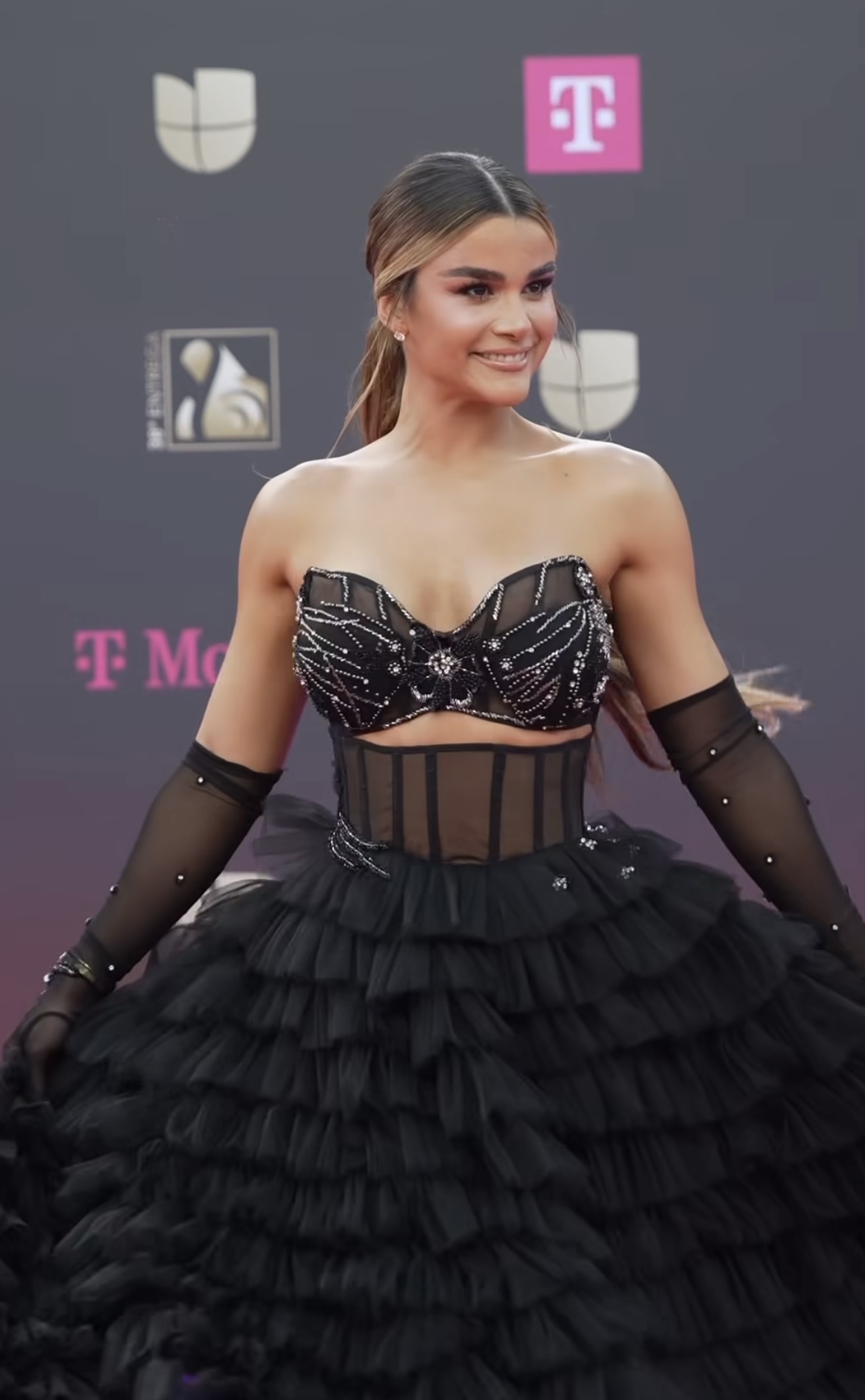 Molina desfiló con un vestido negro de estructura corsé y falda amplia en capas de tul, una silueta que evocó la estética de la alta costura contemporánea. El diseño incorporó un bustier bordado con pedrería y transparencias estratégicas en la zona del torso, acompañado de guantes largos semitransparentes que reforzaron la línea teatral del conjunto.