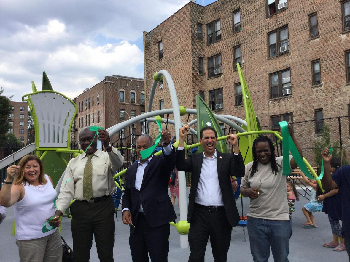 El Comisionado de Parques de Nueva York, Mitchell J. Silver, FAICP, se unió al miembro del Consejo Fernando Cabrera, a los niños de Trabajamos Community HeadStart para cortar la cinta en un Gran Parque de Diversión completamente reconstruido.