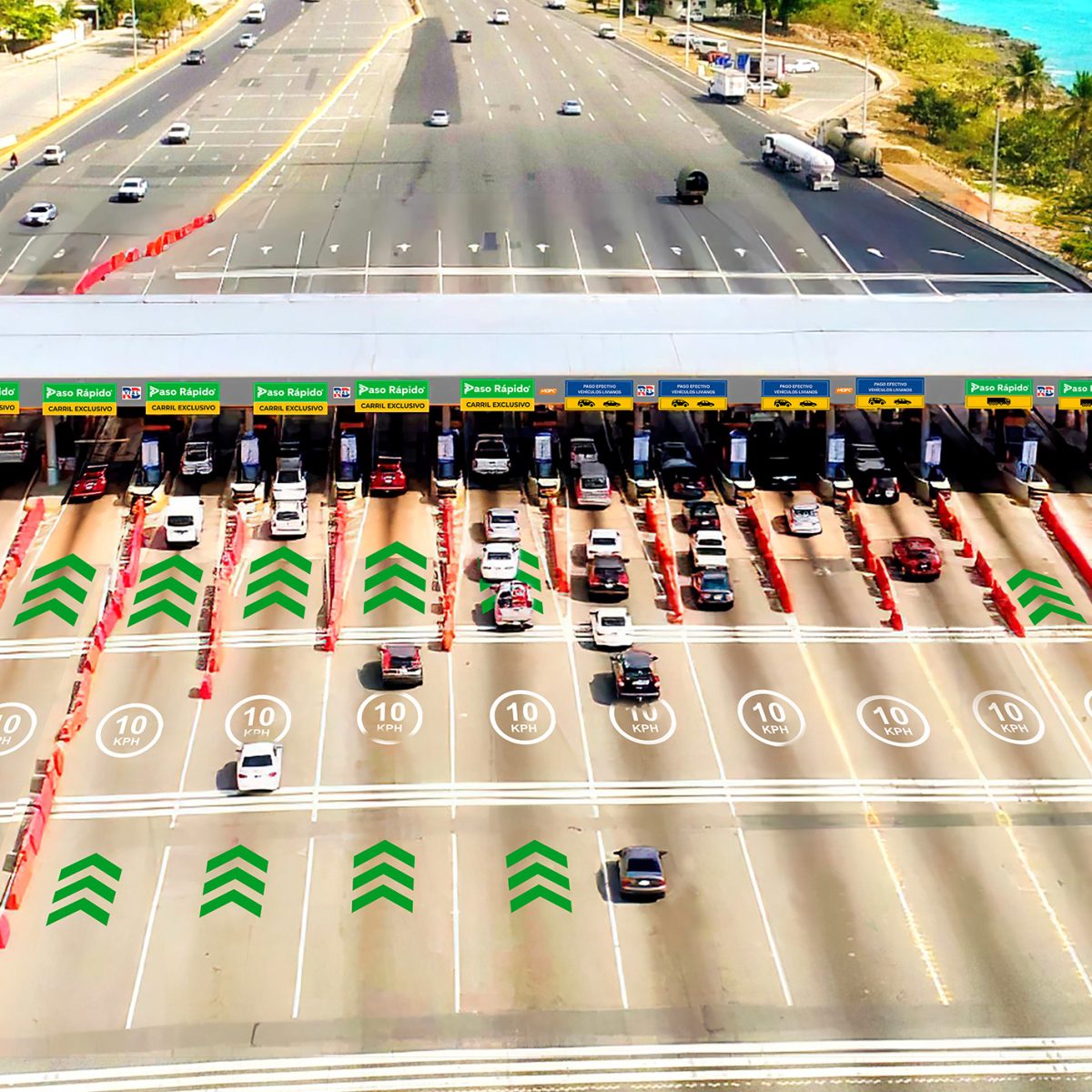 - Identifica el Carril Verde de Paso Rápido: Antes de emprender tu viaje, localiza y reconoce los carriles exclusivos para el Paso Rápido, siempre estarán a tu lado izquierdo en la estación de peaje. Estos carriles están diseñados para proporcionar un flujo rápido y continuo, permitiéndote sortear los embotellamientos en las vías principales.
