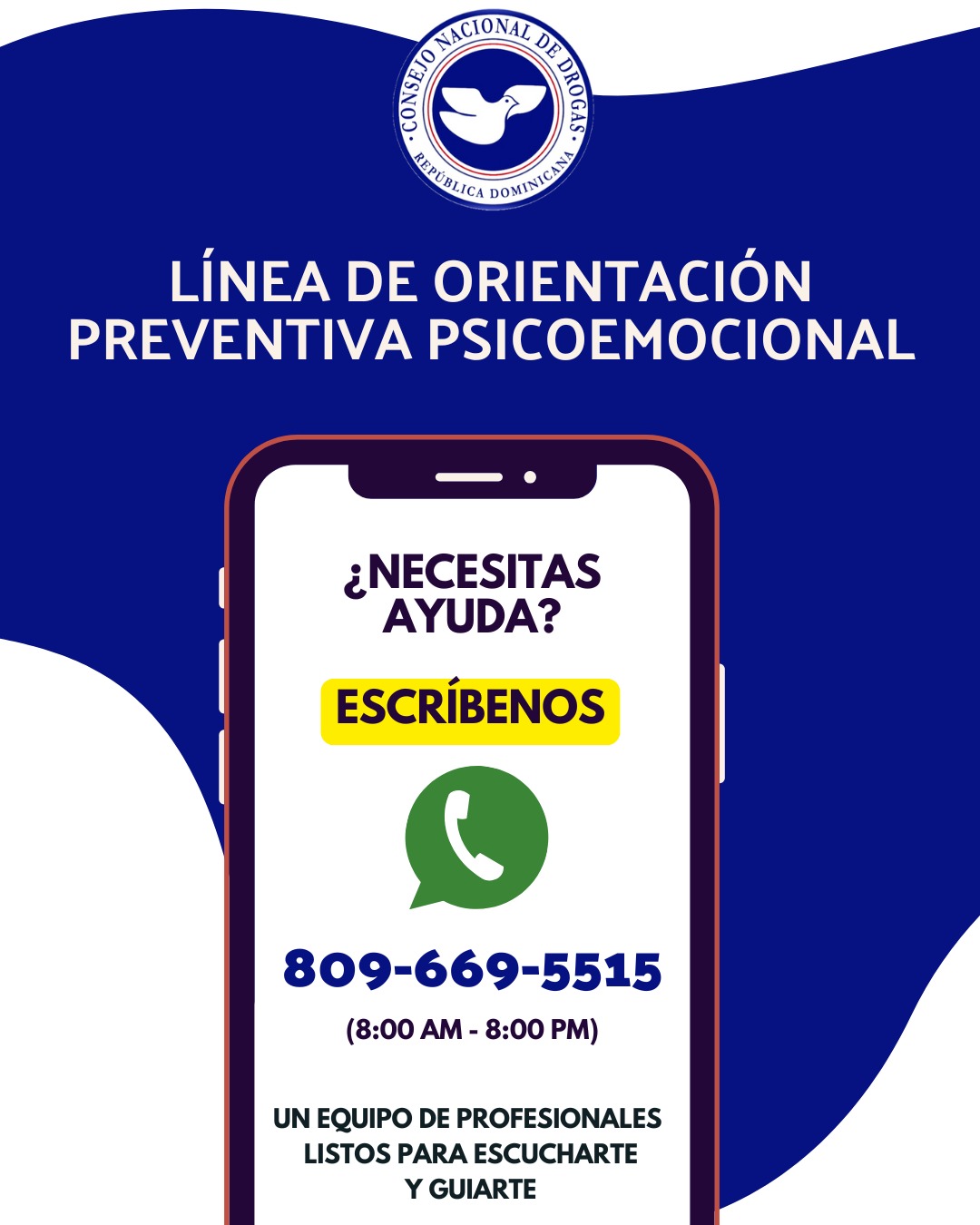 Este canal de comunicación, disponible a través del número de WhatsApp 809-669-5515, busca brindar información profesional y confiable tanto para personas en consumo de sustancias psicoactivas como para sus familias, ofreciendo apoyo emocional en situaciones de crisis, orientación sobre los pasos a seguir y, de ser necesario, canalización hacia centros especializados.