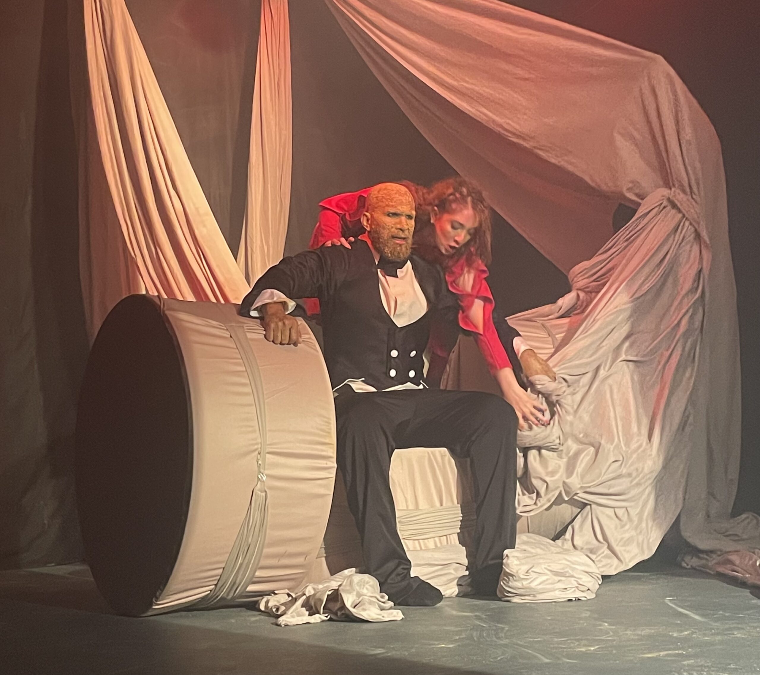 La puesta en escena se aleja de la rigidez del escenario convencional para convertirse en un espacio vivo: tarimas móviles, telas que se transforman, tambores que laten como corazones y que se convierten en vientres, ataúdes o fronteras simbólicas, según el momento. “La tela es protagonista. El escenario es un lienzo en blanco y nosotros, los actores, somos el pincel”, comparte el actor Saúl Rodríguez.