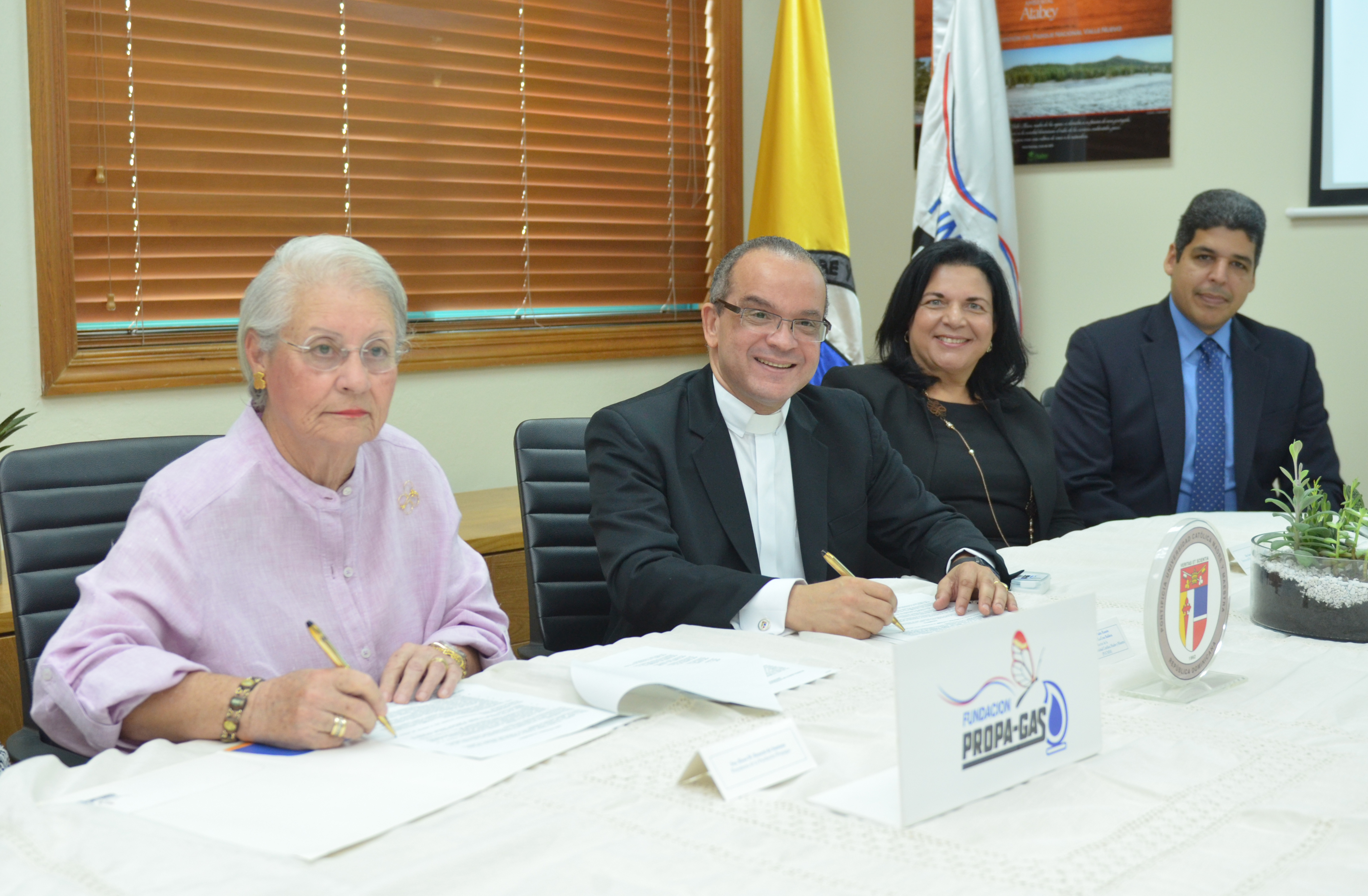 El Acuerdo de colaboración fue rubricado por la Presidenta de la Fundación Propagas, Sra. Rosa. M. Bonetti de Santana y Reverendo Padre Ramón Alfredo De La Cruz Baldera, Rector de la Pontificia Universidad Católica Madre y Maestra (PUCMM), acto que tuvo como escenario las oficinas de la Fundación Propagas, donde además estuvieron presentes la Lic.Jacqueline Malagón, ex Ministra de Educación y Asesora de la Fundación Propagas, y de la PUCMM asistieron la Dra. Sarah González, Directora del Programa PUCMM-INICIA, el Lic. José Luis Ventura Castaños, Director Centro de Innovación Social y Desarrollo Empresarial, Campus Santiago, la Lic. Kathía Guitíerrez, Directora de Comunicaciones PUCMM, a Lic. Sugeiry Sandoval, encargada Unidad de Prensa PUCMM, así como ejecutivos y equipo de la Fundación Propagas.