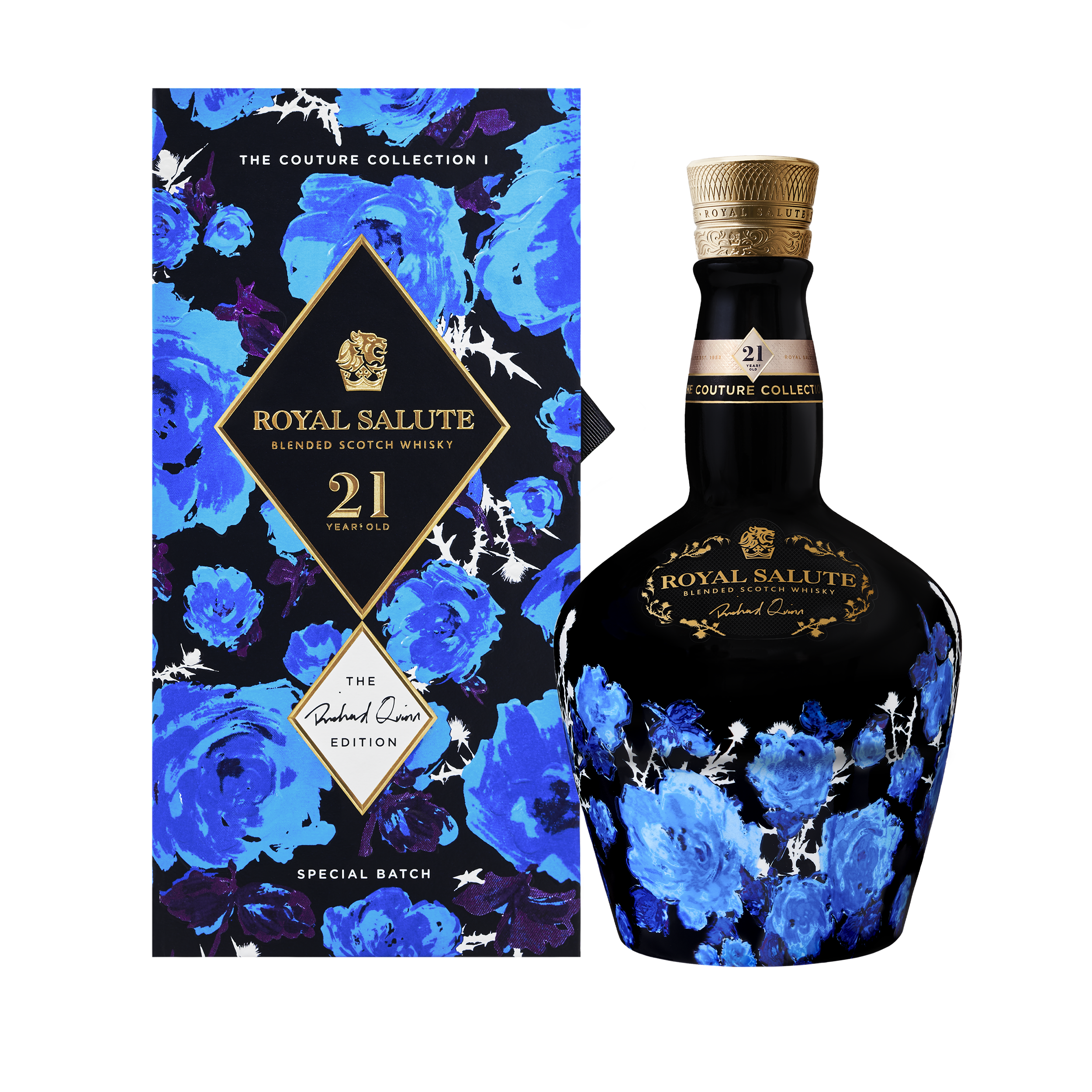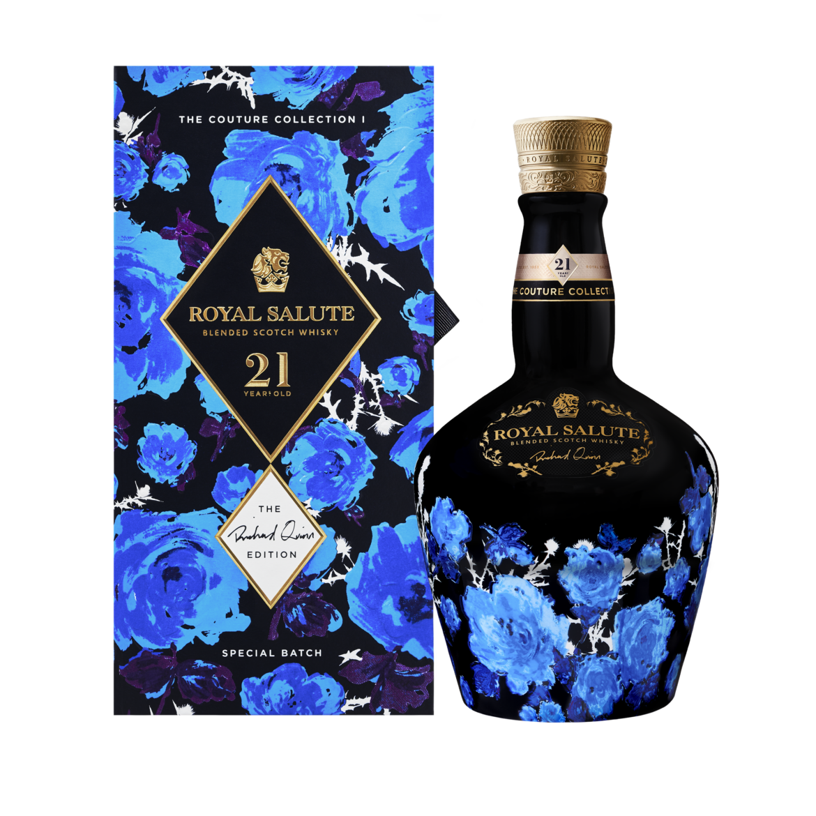 La edición de Richard Quinn de 21 años de la colección Royal Salute Couture se lanzará en cantidades limitadas a partir de septiembre de 2021 y estará disponible en tiendas de lujo selectas de todo el mundo.