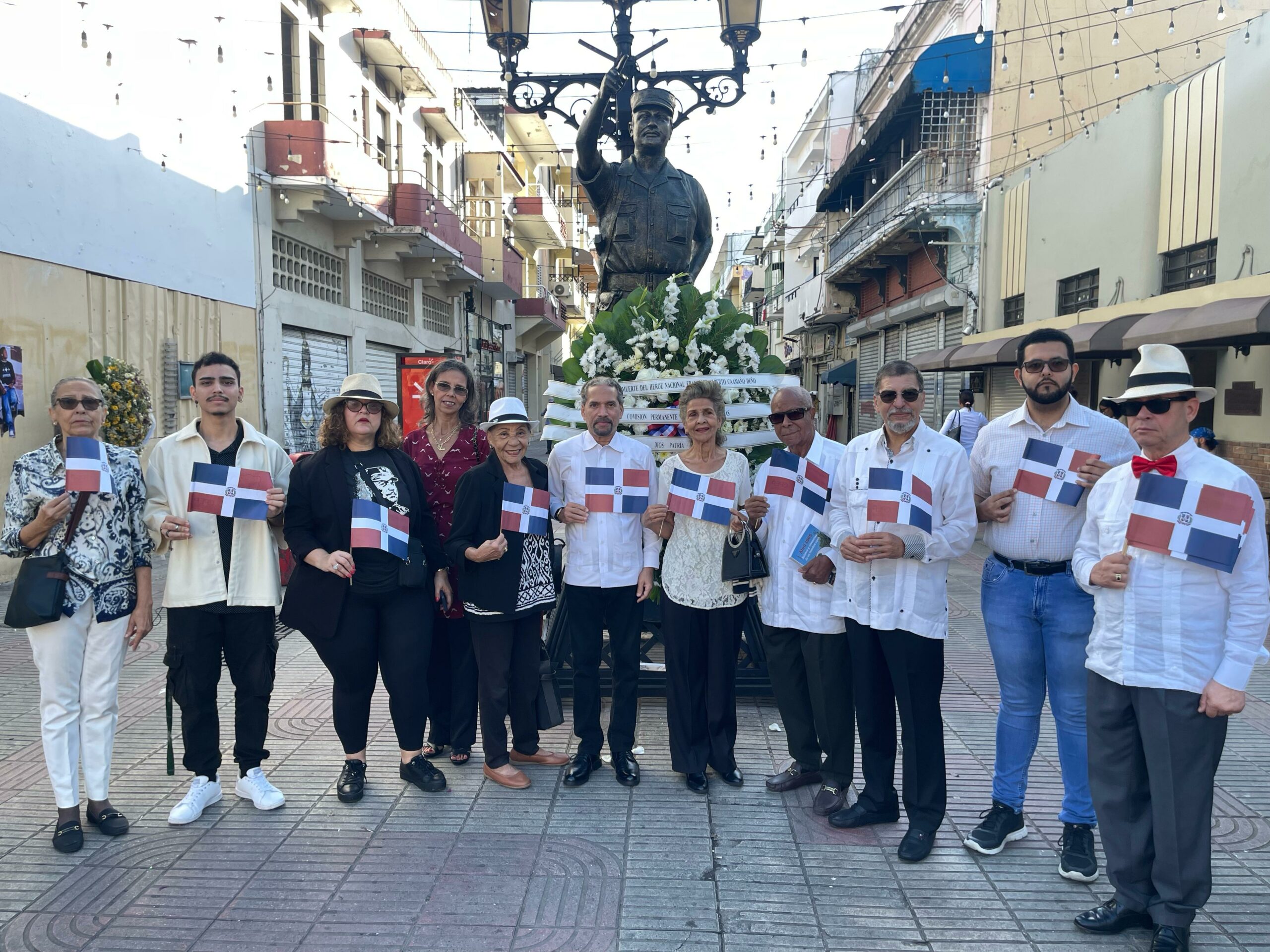 El acto patriótico inició a las 8:00 de la mañana en la estatua de Caamaño, en el parque Independencia, con la interpretación del Himno Nacional, seguido del depósito de ofrendas florales.