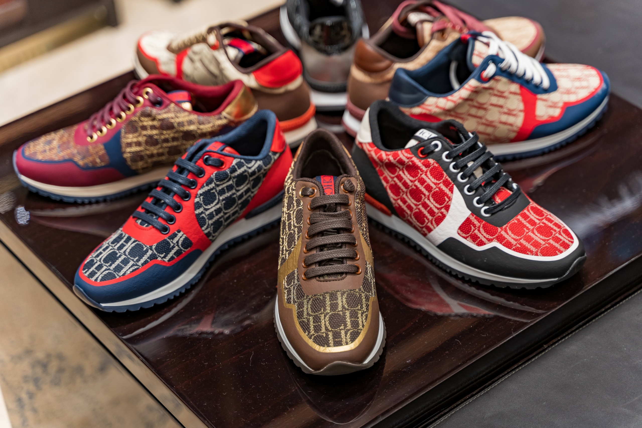 El espacio CH Carolina Herrera rebosa serenidad y elegancia. Los materiales incluyen madera, cuero, seda, lino en bruto y latón envejecido que proporcionan una sensación de confort. El mobiliario especialmente creado para cada tienda está hecho entre otros de roble, ébano de Madagascar, caoba y teca amazónica, lo que hace que uno se sienta como en casa en un ambiente familiar. La iluminación, diseñada estratégicamente para cada espacio, abarca desde áreas más dinámicas a zonas más tranquilas en la que se crean pequeños rincones.