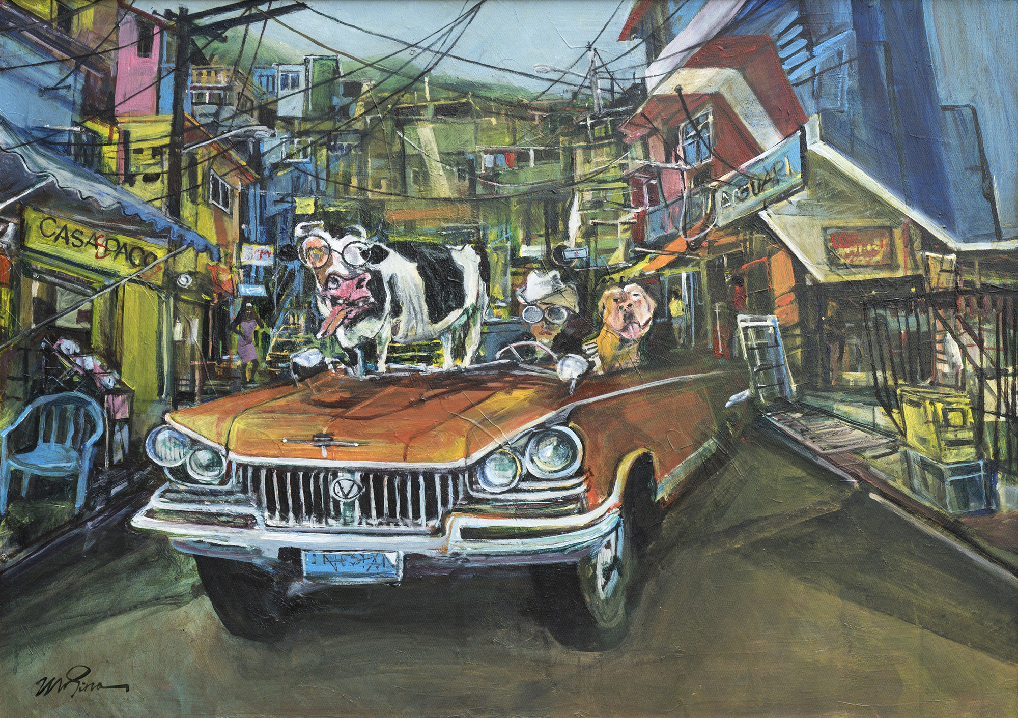 Muchos de sus cuadros exhiben detalles en relieve que suelen sorprender al espectador: el nombre de una calle extraído de una popular canción, la mochila en la espalda de quien no pudo abordar el barco repleto de emigrantes o la vaca que junto al perro acompaña, extrañamente, al conductor de un vehículo de la década de 1960.