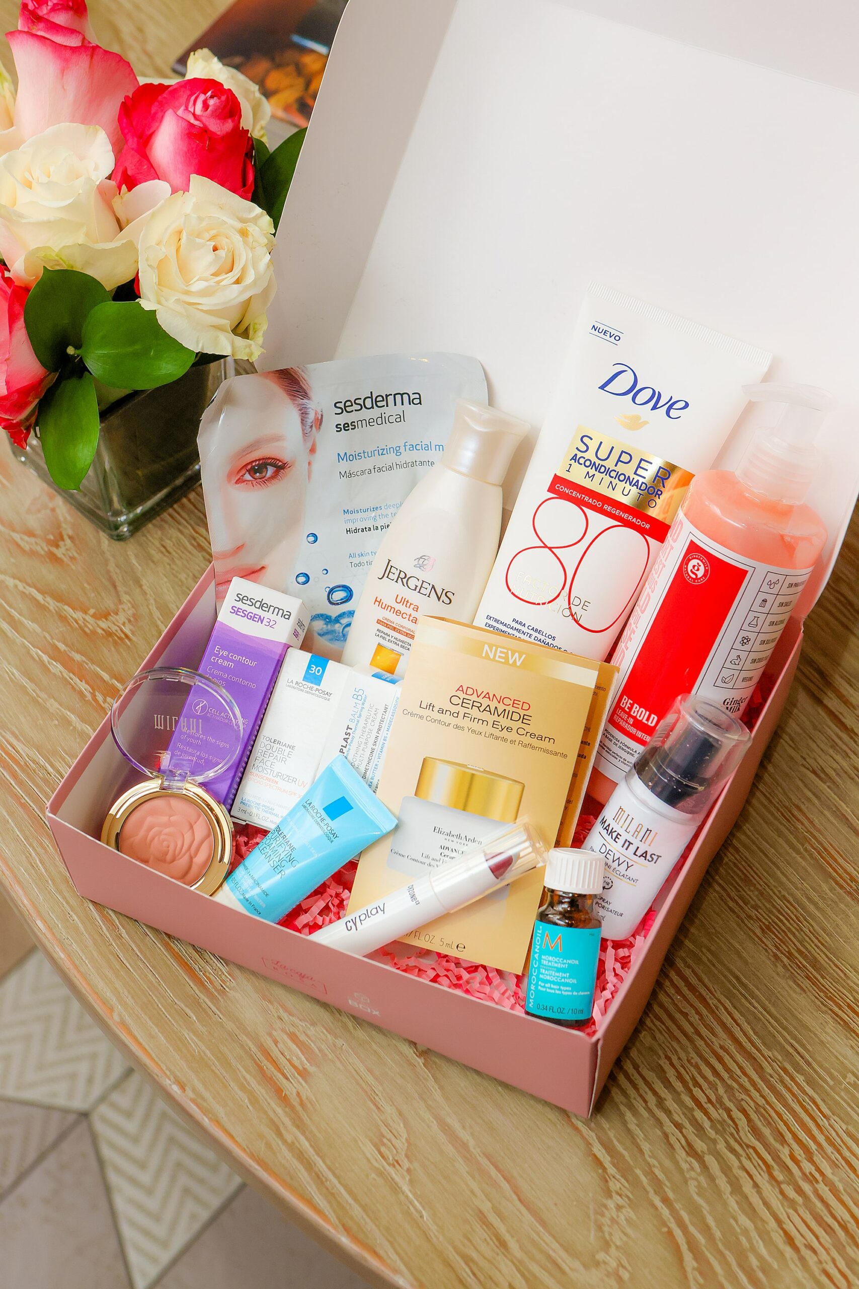 Mensualmente la caja está compuesta por 5 o 6 productos diferentes de cuidado facial, cuidado corporal, maquillaje, cuidado del cabello y estilo de vida femenino y puede ser obtenida por suscripción a través de su página web https://lacajarosa.com