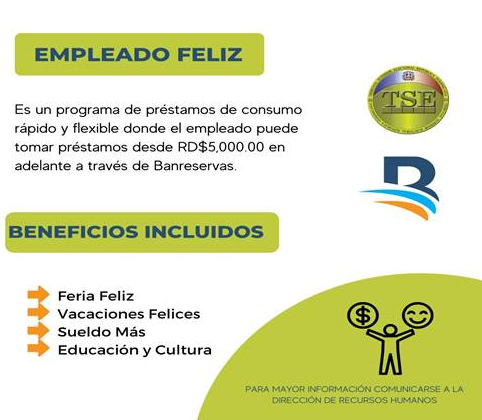 Los servidores del Tribunal Superior Electoral (TSE) podrán aplicar a los programas de “Empleado Feliz”, “Feria Feliz”, “Vacaciones Felices”, “Sueldo Más” y “Educación y Cultura” del Banco de Reservas.