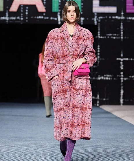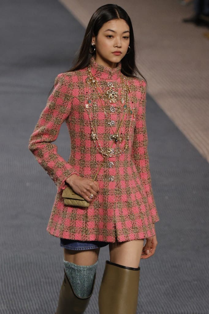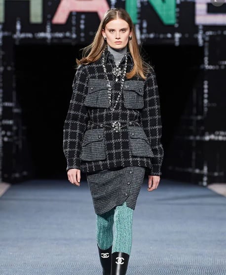 El «tweed«, el tejido de entramado de lana que hizo famosa la firma fundada por Gabrielle Chanel a principios del siglo XX, estuvo en el centro de la pasarela, pues vistió muros, asientos e incluso el suelo por el que pasaban las modelos.