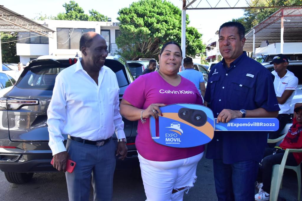1. Katty Salvador, propietaria de una clínica de terapia, recibe las llaves de un vehículo que financió en Expomóvil Banreservas 2022. La entrega la realizó Ysidro García, subadministrador de Negocios de la entidad bancaria.