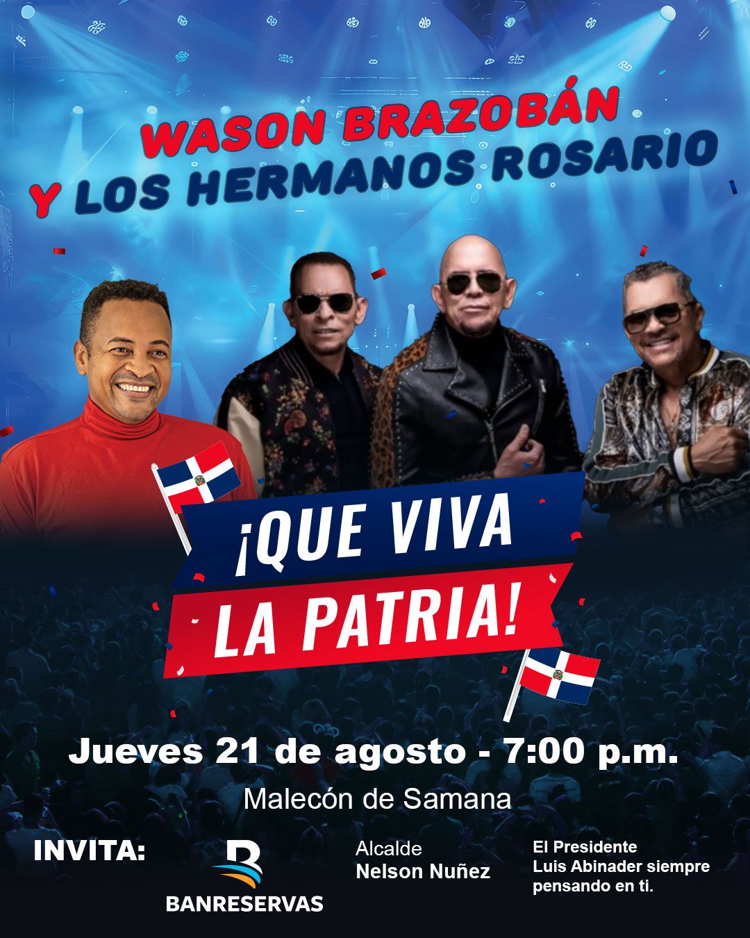 Jueves 21 de agosto – SamanáLugar: Malecón de SamanáArtistas: Wason Brazobán y Los Hermanos RosarioAlcalde Nelson Núñez