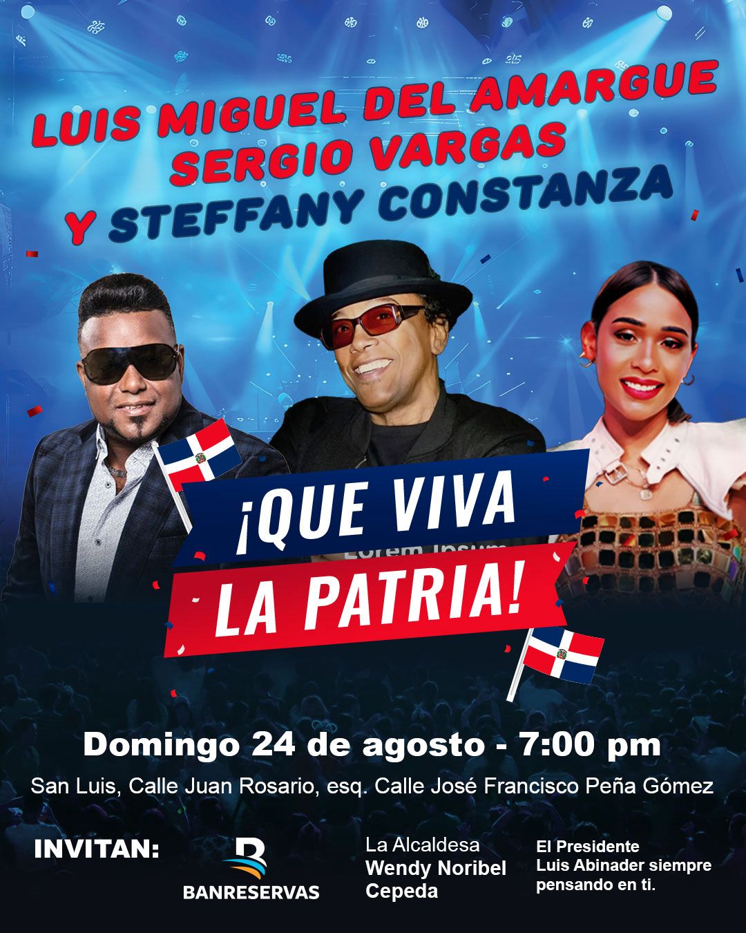 Domingo 24 de agosto – San LuisLugar: Calles Juan Rosario esquina José Francisco Peña GómezArtistas: Luis Miguel del Amargue, Sergio Vargas y Steffany Constanza.Alcaldesa Wendy Noribel Cepeda