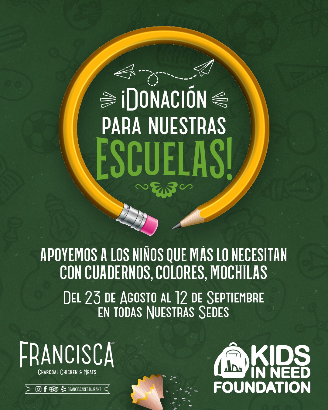 Kids In Need Foundation es una organización sin fines de lucro cuya misión es garantizar que todos los niños estén preparados para aprender y tener éxito en el aula a través de su red de 42 centros de recursos establecidos en todo Estados Unidos. Francisca Restaurant está comprometida con programas y acciones de responsabilidad social, como reflejo del compromiso a las comunidades donde sirve a sus clientes.
