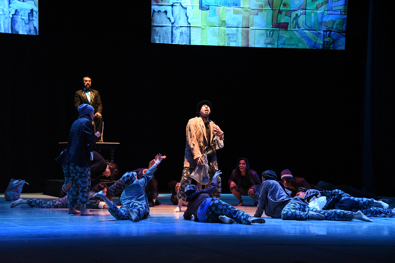La función “El Señor Presidente”, dirigida por Fernando Juárez, captó la atención del público incluso en el preludio de que el telón se abriera. Los bailarines salieron de repente por varios rincones del teatro con vestimentas rasgadas que se hacían acompañar de gritos y murmullos dementes. Interactuaron con los presentes, quienes no cesaban los aplausos.