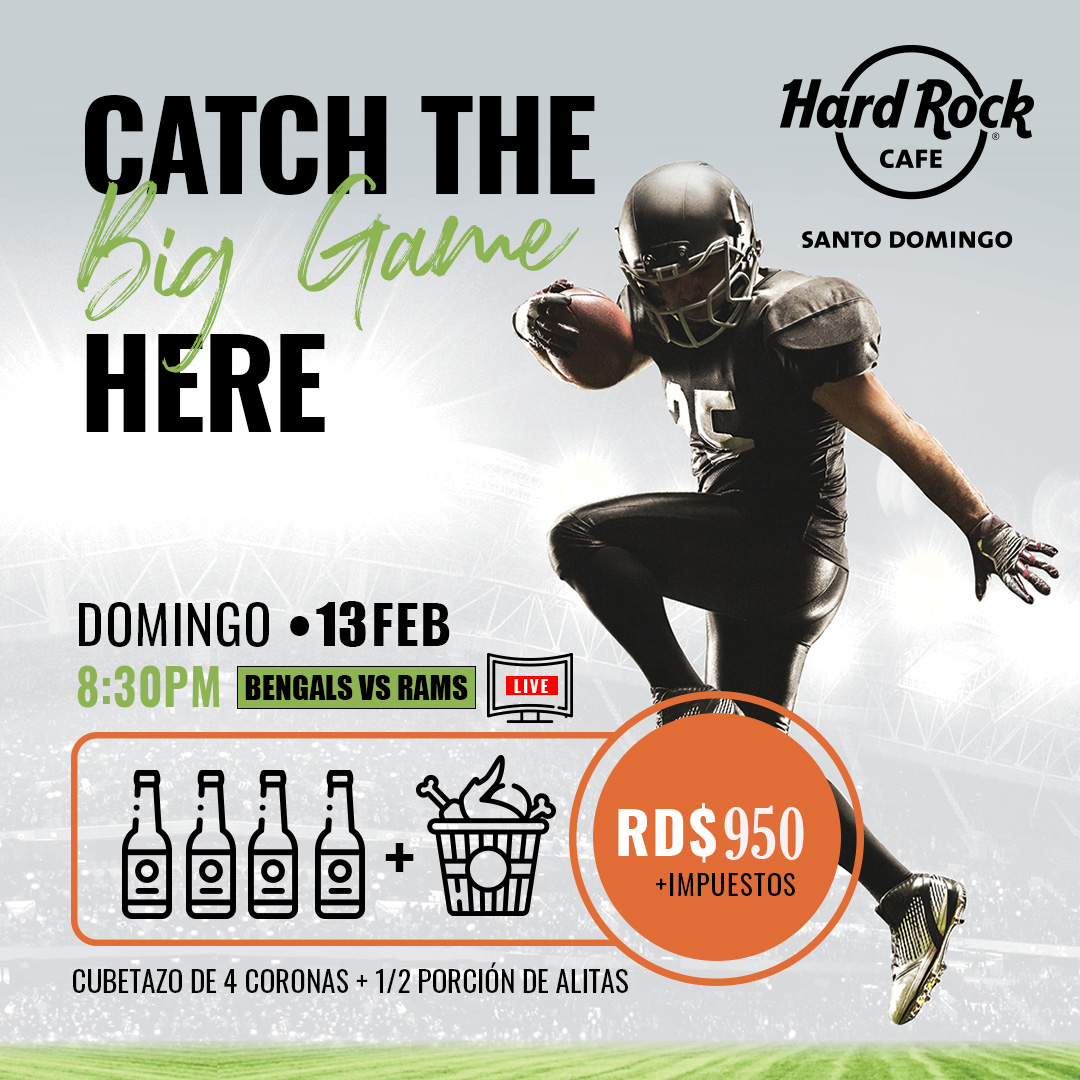 Hard Rock Cafe (@hrcsd) siempre está a la vanguardia con sus propuestas al más alto nivel que en esta ocasión incluyen la puesta a disposición de sus comensales de su espacio para el disfrute de grandes eventos deportivos como el Super Bowl, pautado para este domingo 13 de febrero a partir de las 8:00 de la noche.