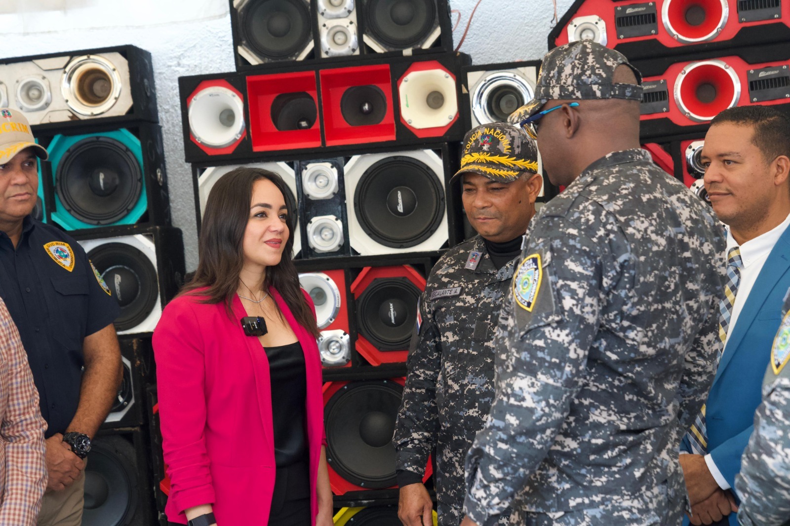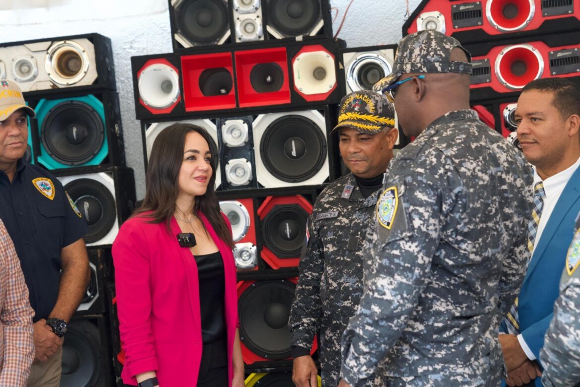 La ministra de Interior y Policía, Faride Raful, entregó a la Procuraduría Especializada de Medio Ambiente en Santo Domingo Oeste 225 bocinas, incautadas en espacios públicos y centros de expendios de bebidas alcohólicas, dónde también decomisaron 205 cámaras de videovigilancia y más de 5,000 mil armas blancas, durante los Operativos Garantía de Paz.