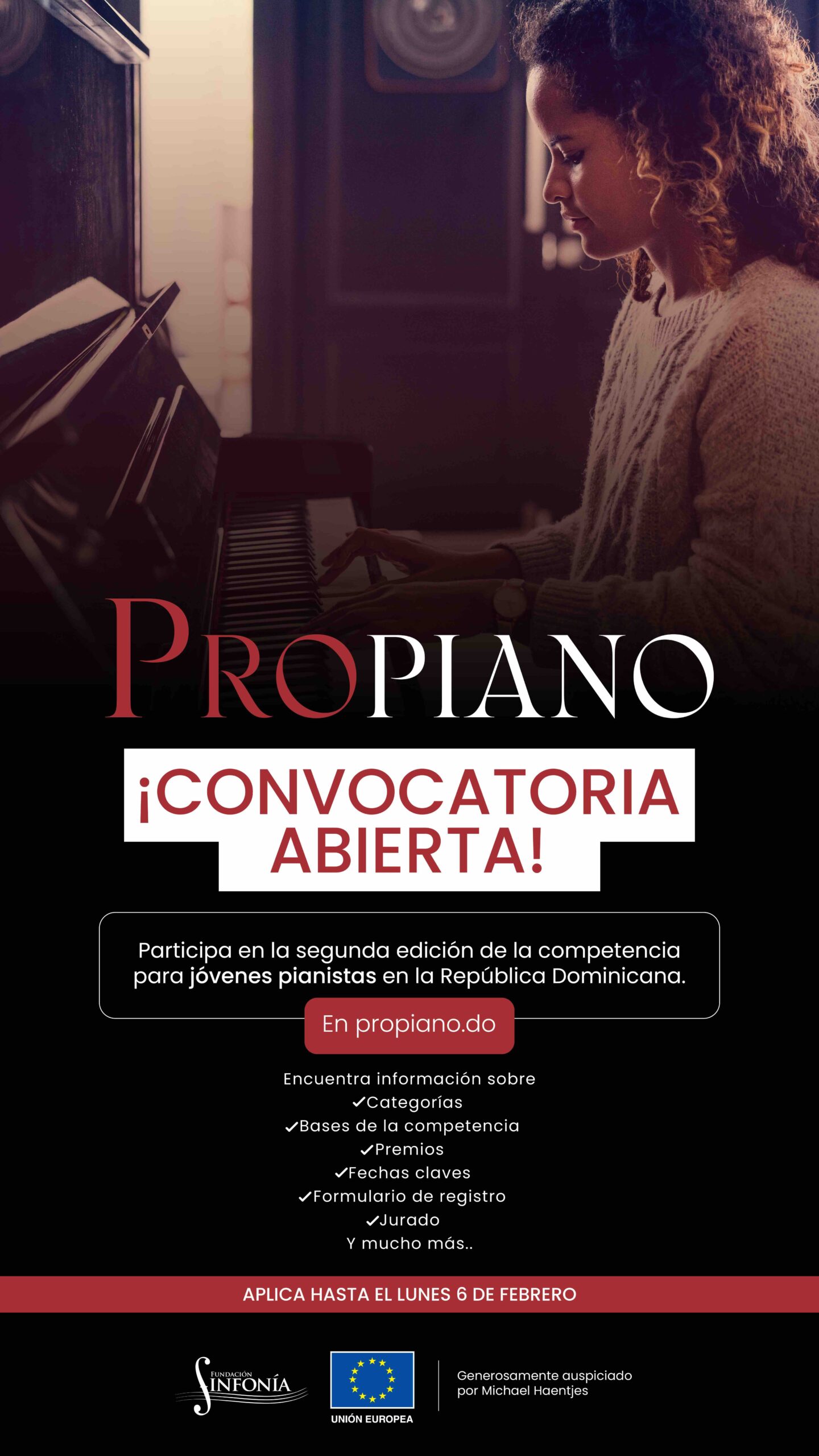 Esta iniciativa, generosamente auspiciada por Michael Haentjes, busca promover el estudio y la práctica del piano en jóvenes de distintas edades y de todas partes del país. Los participantes pueden enviar sus aplicaciones hasta el lunes 6 de febrero, a través de la página oficial de la competencia www.propiano.do