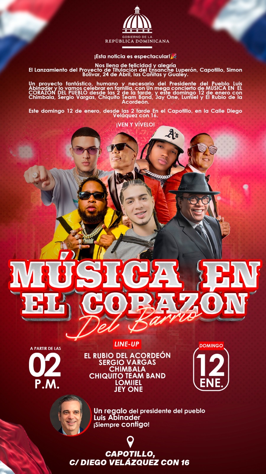 El hito será celebrado con el mega concierto “Música en el Corazón del Barrio”, un espectáculo que promete alegría y unidad a través del talento de reconocidos artistas nacionales como El Rubio del Acordeón, Chimbala, Sergio Vargas, Chiquito Team Band, Jay One y Lumiel. La actividad se llevará a cabo a partir de las 2:00 p.m. en la intersección de las calles Diego Velázquez y 16, en el corazón del sector Capotillo.