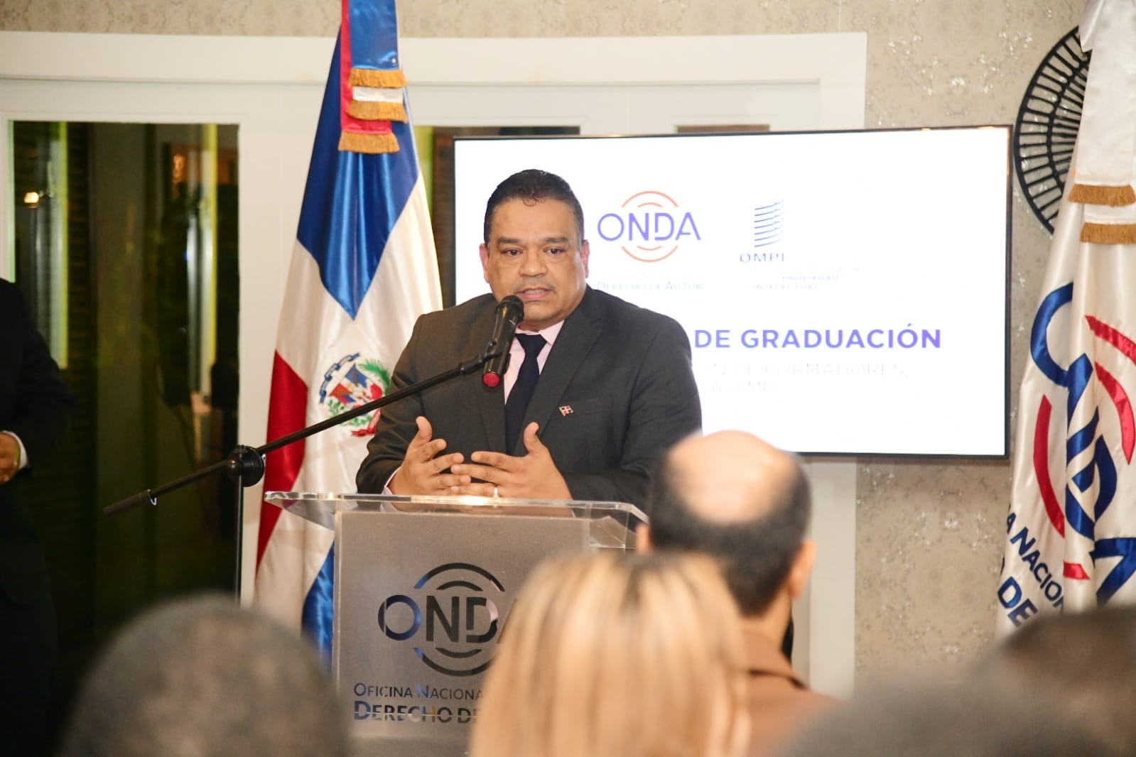 Antes de que hablara el director de la ONDA, se dirigió a los graduandos el representante de la OMPI, señor Zapata, quien destacó el significado que para el derecho de autor y la República Dominicana tiene esta graduación.