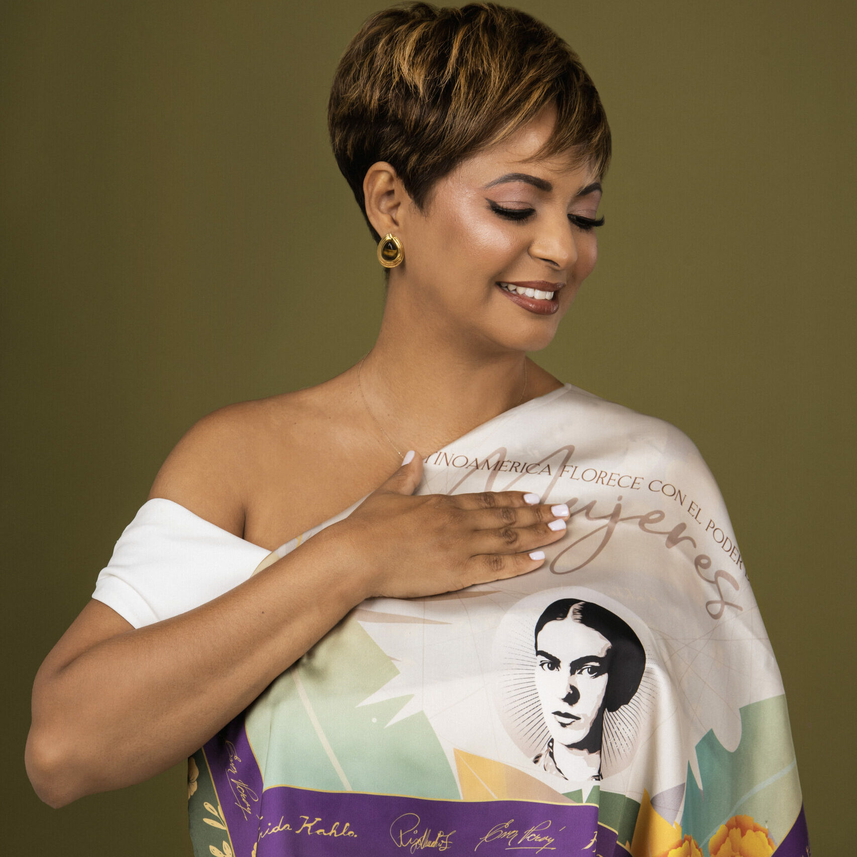 Inspirada en la fuerza de las mujeres latinoamericanas, esta pañoleta busca sanar, empoderar y transformar con cada pieza elaborada. Desde 2019, Nina Vásquez ha creado estampados que cuentan historias: cartas de las Hermanas Mirabal, monumentos e iglesias, convirtiendo cada diseño en un manifiesto de resistencia y memoria. Hoy, su mirada se expande al continente, rindiendo homenaje a tres figuras icónicas que representan la fuerza femenina: