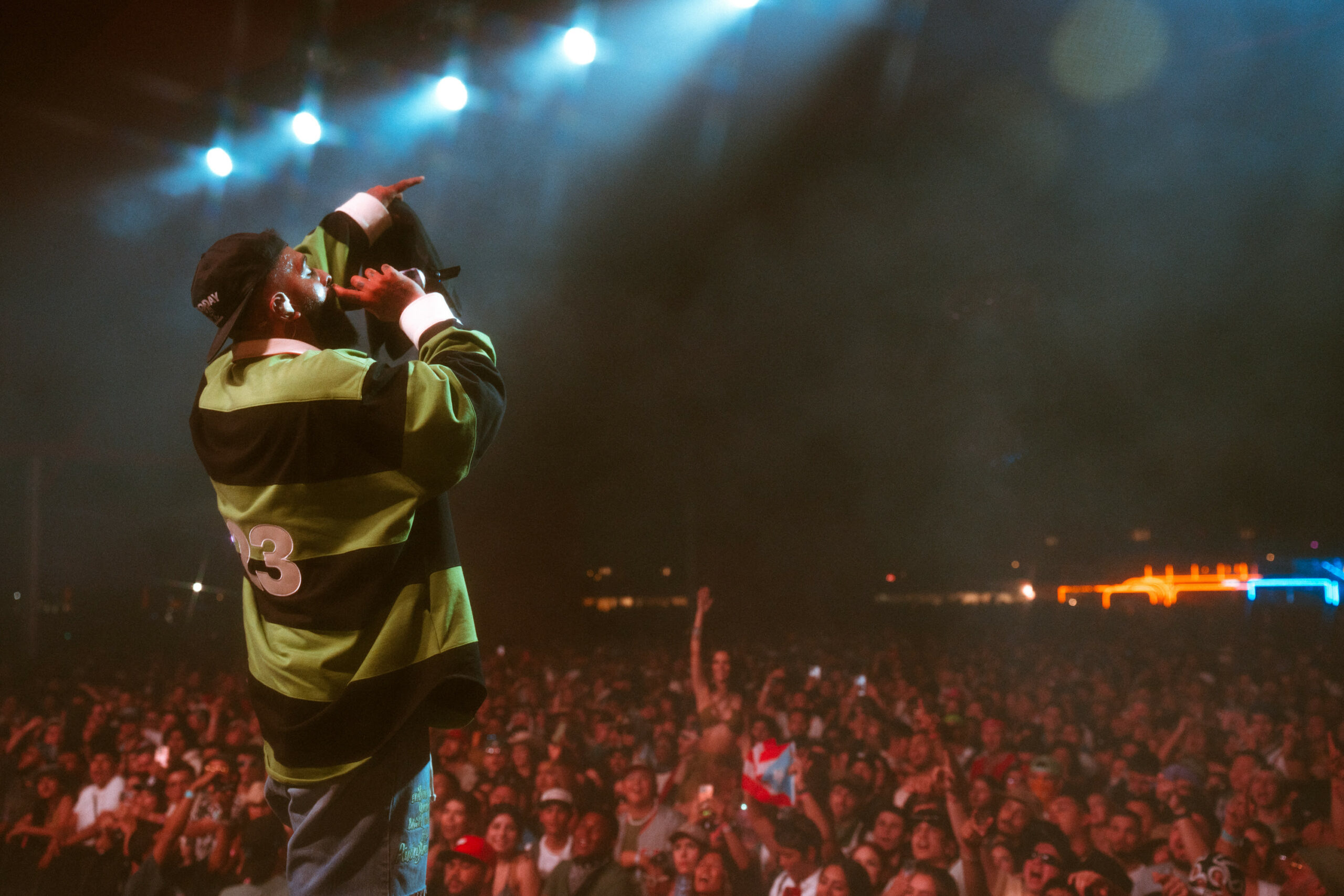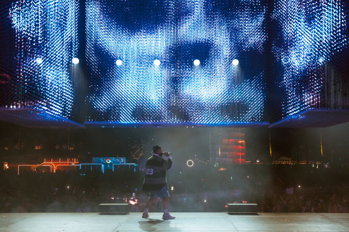 Poco después, las pantallas comenzaron a levantarse mostrando imágenes con apariencia humana del nominado al Latin GRAMMY, lo que permitió a los fanáticos verlo claramente. Tan pronto se reveló por completo, Eladio se apoderó del Gobi Tent con su energía electrizante que hizo que la multitud saltara. La energía solo continuó intoxicando a los asistentes mientras los llevaba en un viaje de su repertorio con canciones como “Mbappé,” “Tata,” “Tusi,” “Coco Chanel,” “Me Gustas Natural,” “Cuevita,” y “Kemba Walker,” entre otras.