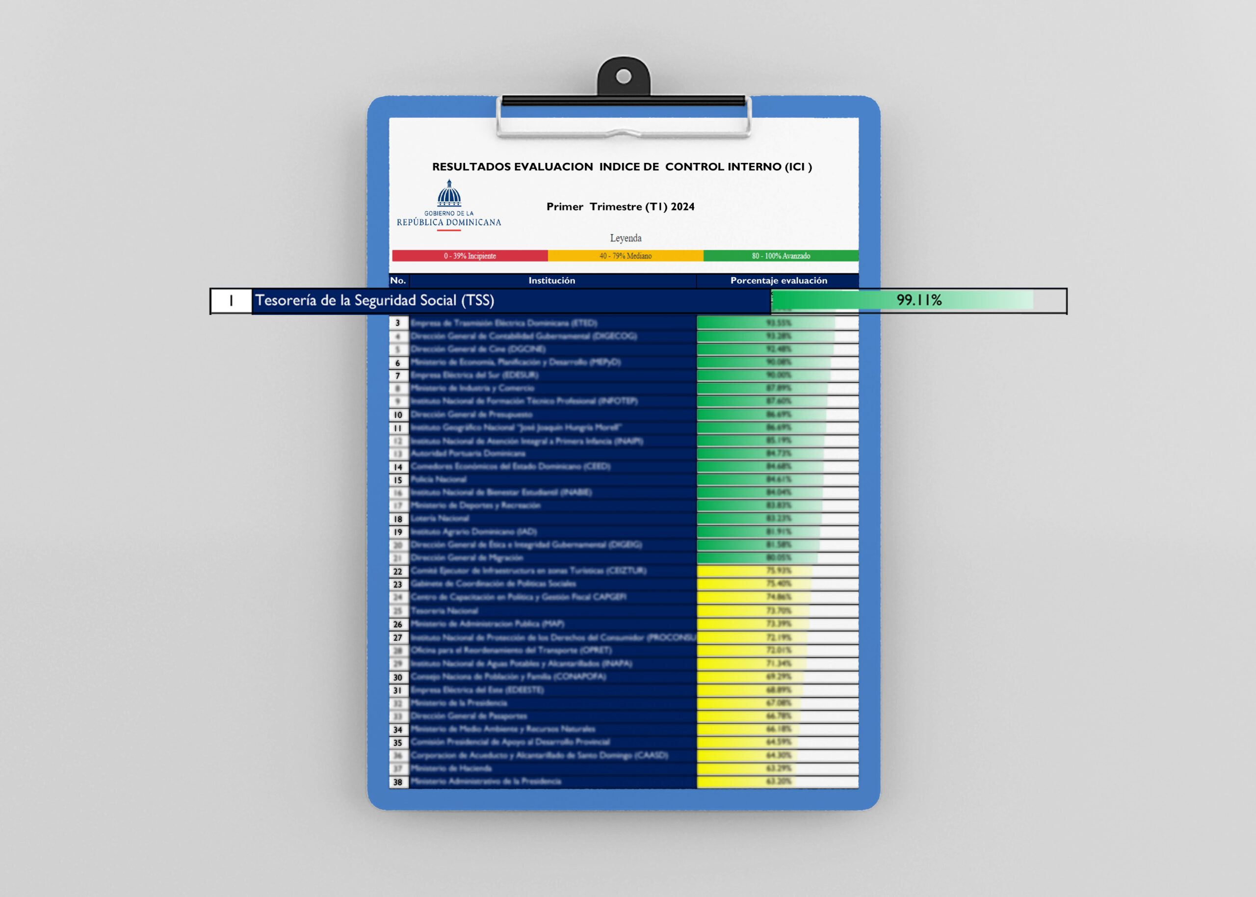 La Tesorería de la Seguridad Social (TSS) ha sido reconocida como la institución pública mejor evaluada en el Índice de Control Interno (ICI) durante el primer trimestre de 2024, obteniendo un puntaje sobresaliente de 99.11%. Estos resultados fueron anunciados por la Contraloría General de la República (CGR), destacando el compromiso de la TSS con la transparencia y la correcta administración de los recursos públicos.