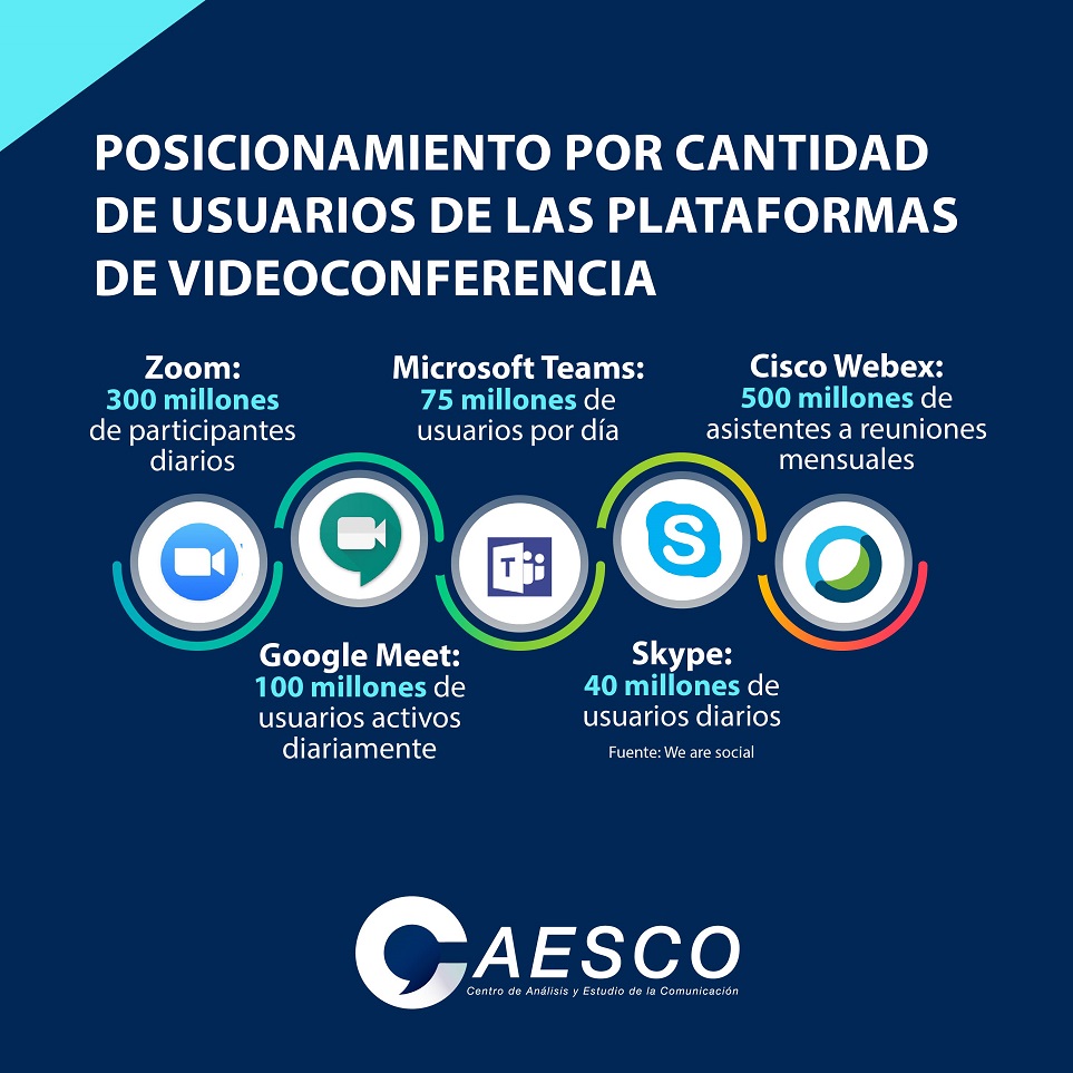 El Centro de Análisis y Estudio de la Comunicación (CAESCO) República Dominicana, difundió el reporte de las firmas We are social y Hootsuite en el cual revelan el posicionamiento por cantidad de usuarios de las plataformas de videoconferencia Zoom, Google Meet, Microsoft Team, Skype y Cisco Webex.