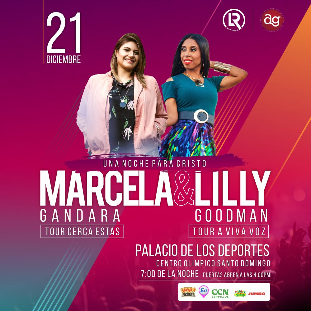 Lilly Goodman y Marcela Gándara se presentan por primera vez juntas en el Palacio de los Deportes de Santo Domingo para un concierto multitudinario que recogerá sus mejores canciones de adoración y alabanzas, llamado “Una Noche para Cristo”. Las boletas estarán a la venta en Uepa Tickets CCN Jumbo Supermercados Nacional a partir de la próxima semana.