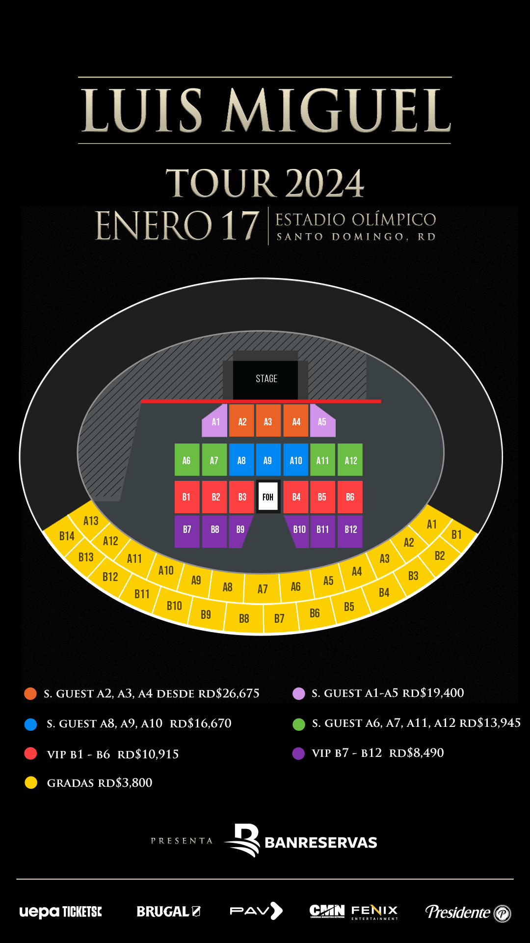 El empresario Pablo Pou de Pav Events, encargado de la producción del concierto, ha dado a conocer que los fanáticos que compren sus entradas en esta primera etapa exclusiva con tarjetas Banreservas disfrutarán de un 15% de descuento, una oferta que no se debe dejar pasar. Los precios de las boletas parten desde RD$3,800 (precio sin descuento) y se pueden adquirir en el sitio web oficial uepatickets.