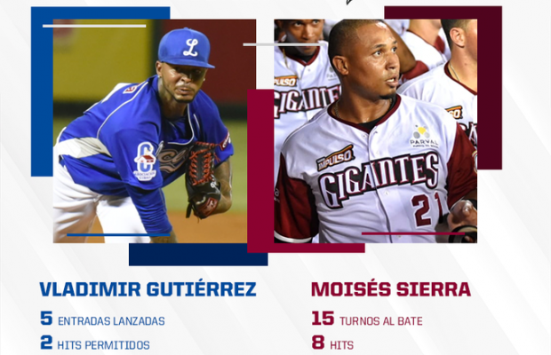 Santo Domingo.-El jardinero, Moisés Sierra, de los Gigantes de Cibao, y Vladimir Gutiérrez, de los Tigres del Licey, fueron electos como los ganadores del premio Pelotero Estrella de la Semana de la Liga de Béisbol Profesional de República Dominicana (Lidom) .