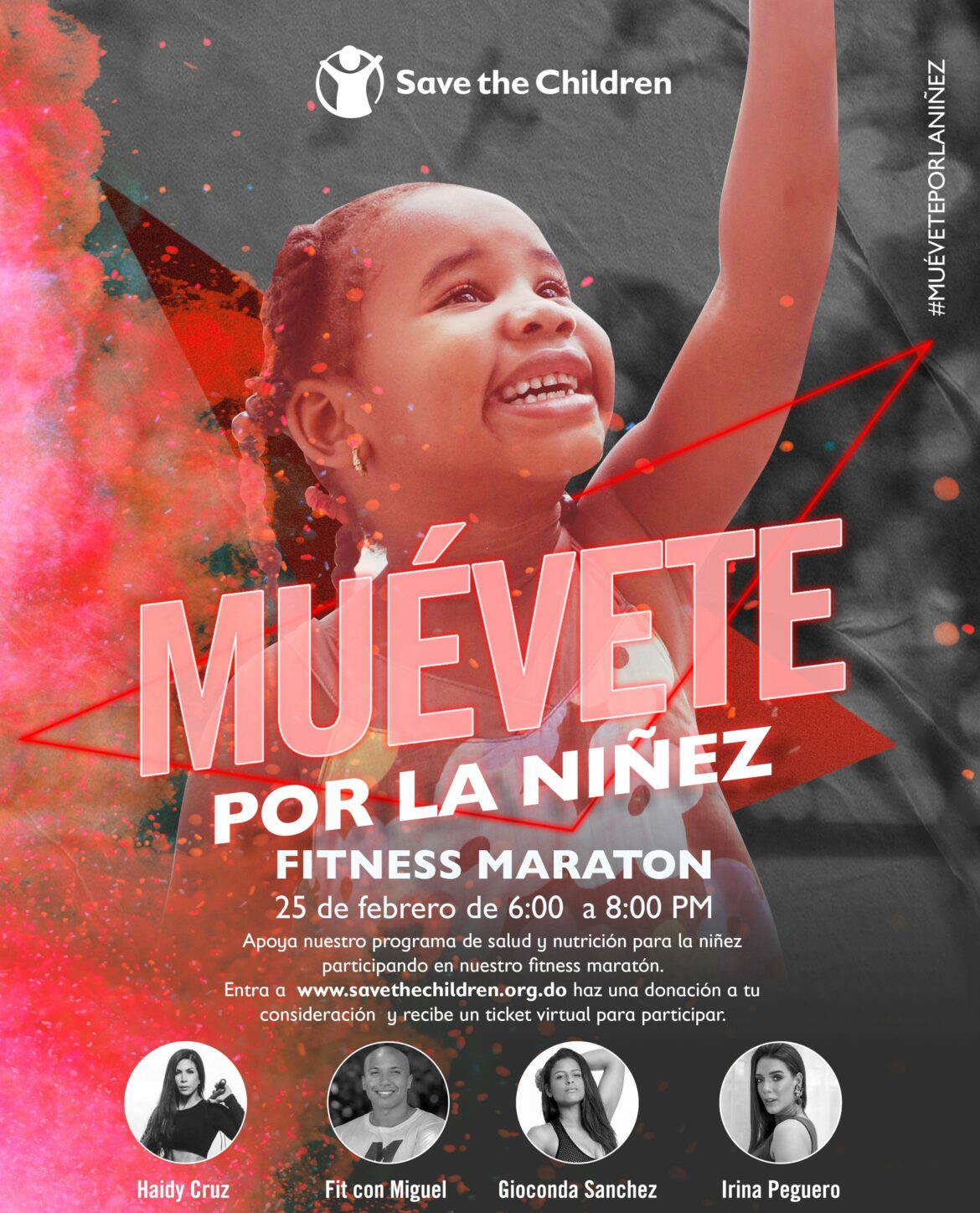Save the Children Dominicana inició el proceso de inscripción del “Muévete por la niñez” Fitness Marathon. Un evento virtual impartido por los líderes de los fitness dominicanos: Haidy Cruz, Miguel Tejeda, Gioconda Sánchez e Irina Peguero. El 25 de febrero de 6.00 a 8.00 de la noche.