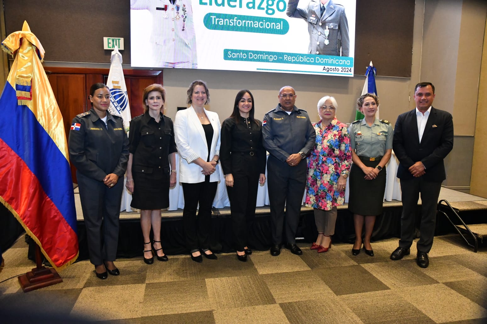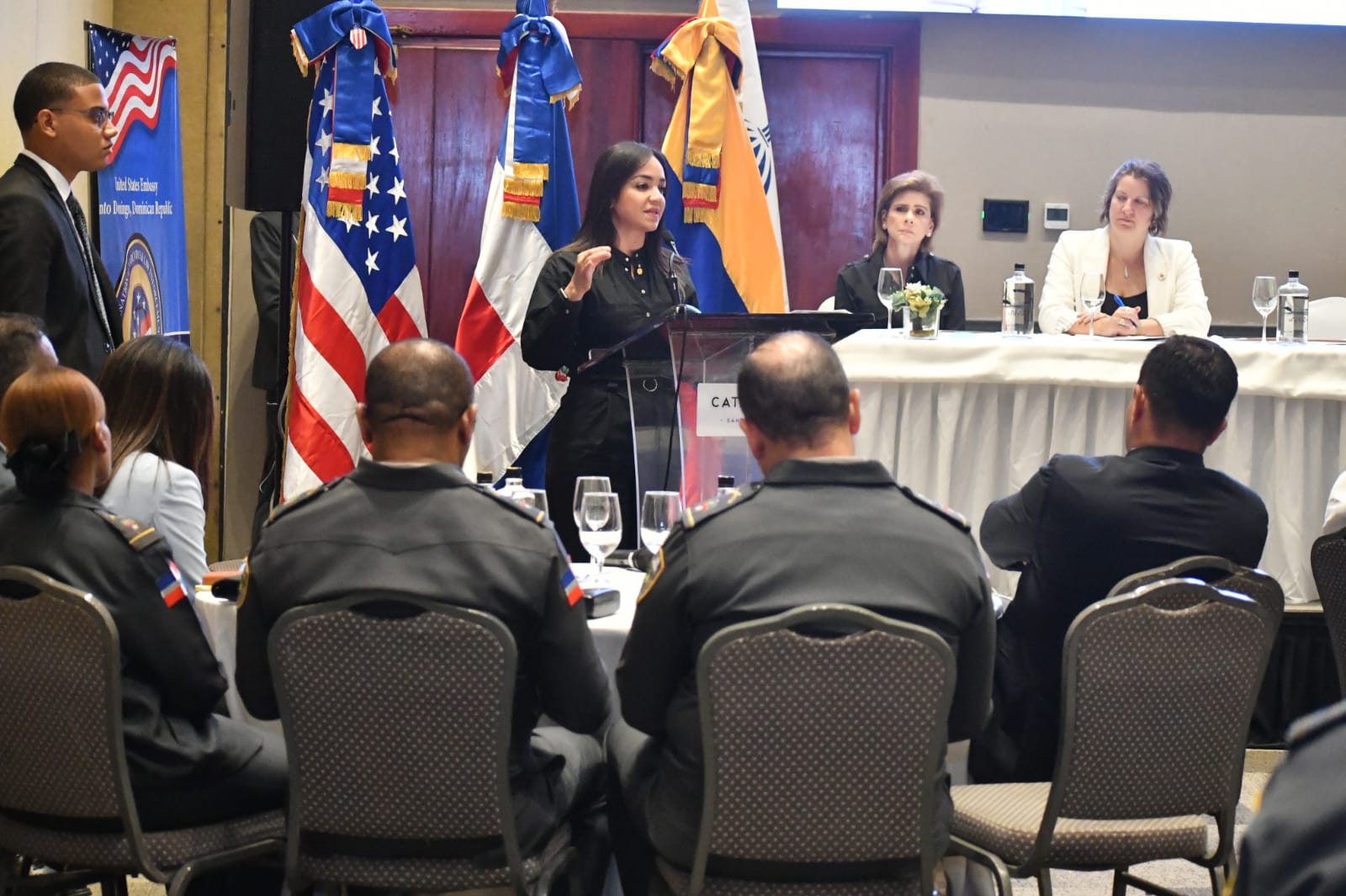 En la ceremonia estuvieron Mu-Kien Sang Ben, directora ejecutiva de la Comisión Técnica para la Reestructuración del Sistema Educativo de la Policía Nacional; Rosa Angela Peña, asesora del INL; Jerfhy Pérez, representante del asesor del Poder Ejecutivo; Elena Viyella de Paliza, miembro de la Comisión Ejecutiva, y agentes policiales.