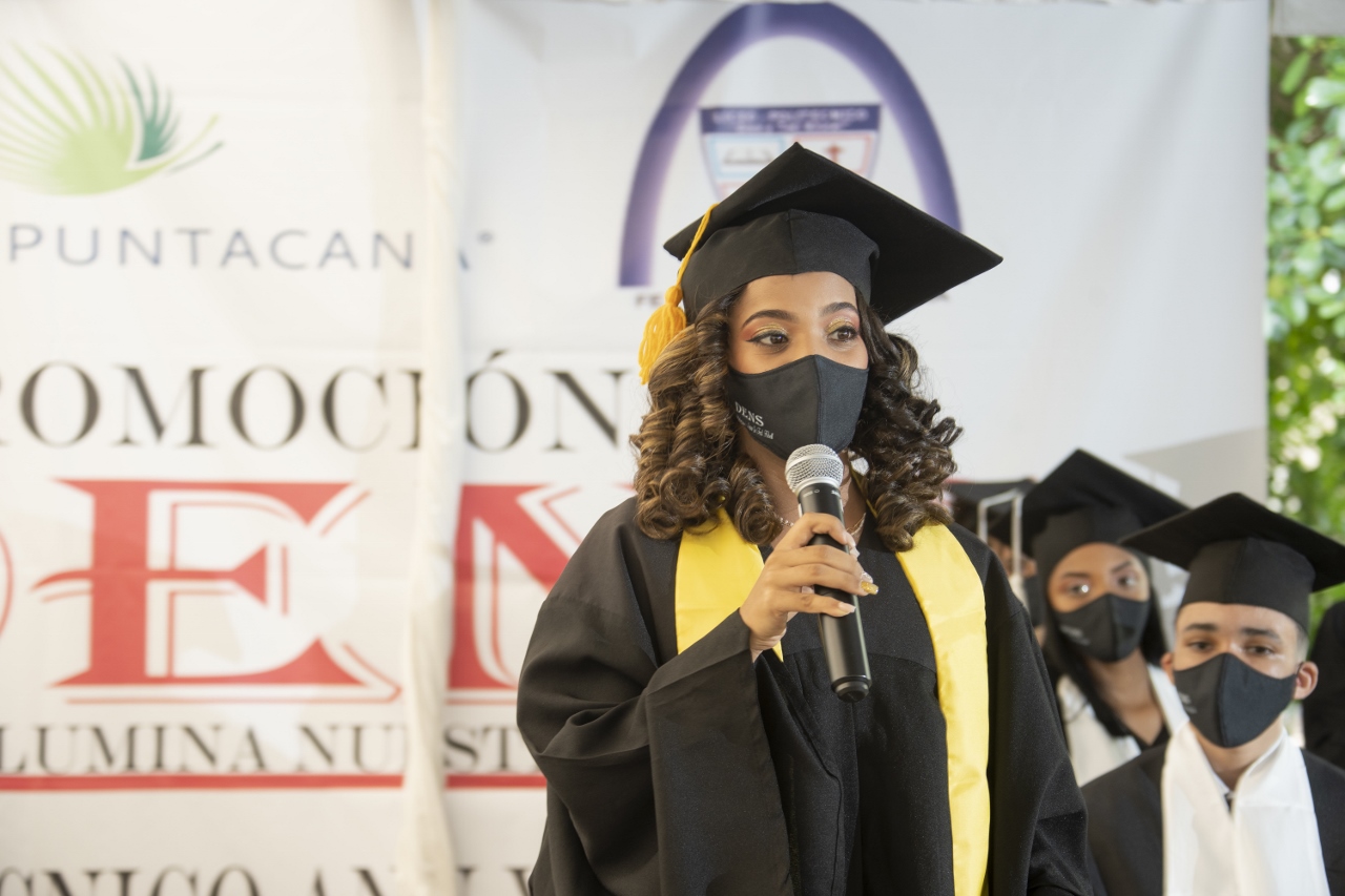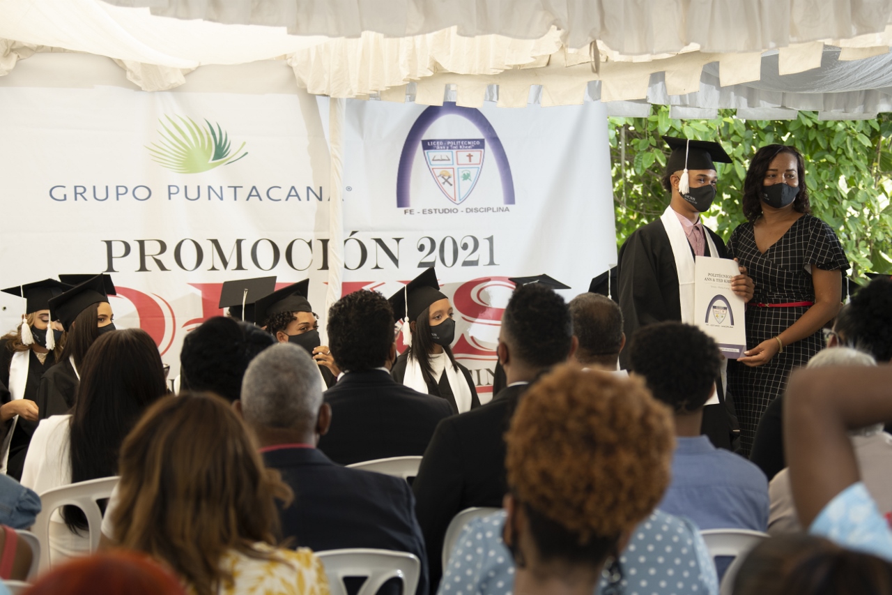 Verón, La Altagracia. – El Politécnico Ann & Ted Kheel, un proyecto de educación normal y técnica de la Fundación Grupo Puntacana, entregó 72 nuevos bachilleres técnicos a la comunidad de Verón. En su decimosexta ceremonia de graduación, celebrada con gran emotividad y siguiendo los protocolos de bioseguridad, fueron reconocidos profesores y estudiantes meritorios del año escolar 2020-2021.