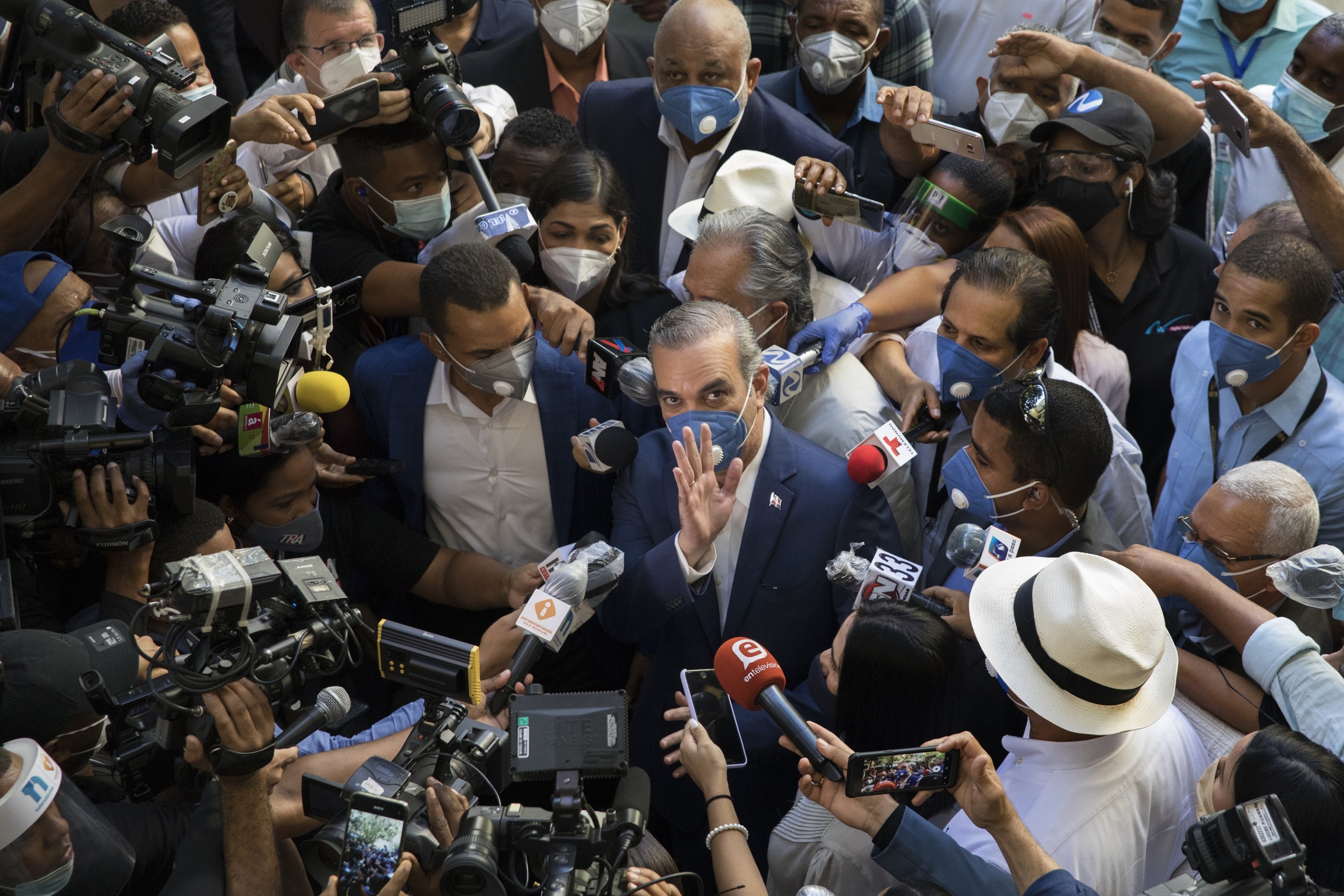 La instantánea de Fernández retrata el momento histórico cuando el entonces presidente electo de la República, Luis Abinader, fue abordado masivamente por los medios de comunicación tras informarse su elección como ganador de los pasados comicios electorales