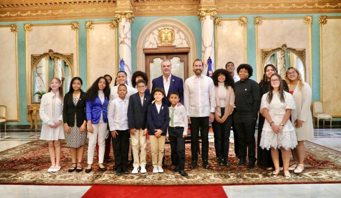 Santo Domingo, 31 de agosto de 2023 – En un emotivo encuentro que tuvo lugar en el Salón de Embajadores del Palacio Nacional, el presidente de la República Dominicana, Luis Abinader, recibió con orgullo a un grupo de 17 estudiantes meritorios, quienes son hijos de dominicanos que residen en el extranjero. El mandatario elogió el destacado desempeño académico de estos jóvenes y reafirmó su compromiso con la educación y el desarrollo de la diáspora dominicana.