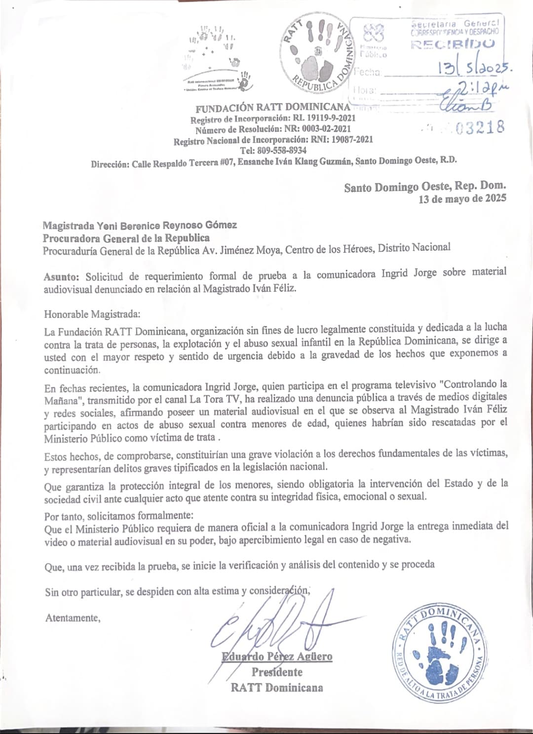 Santo Domingo, D.N. La Fundación Red al Alto a la Trata y Tráfico de Personas (RATT), solicitó vía comunicación formal a la magistrada Yeni Berenice Reynoso, requerir a la comunicadora Ingrid Jorge las pruebas audiovisuales que según esta posee en contra del magistrado de la Procuraduría Especializada contra los Delitos Electorales Ivan Féliz, abusando sexualmente de niñas en calidad de víctimas de trata y tráfico, quienes habrían sido rescatadas por el Ministerio Público.