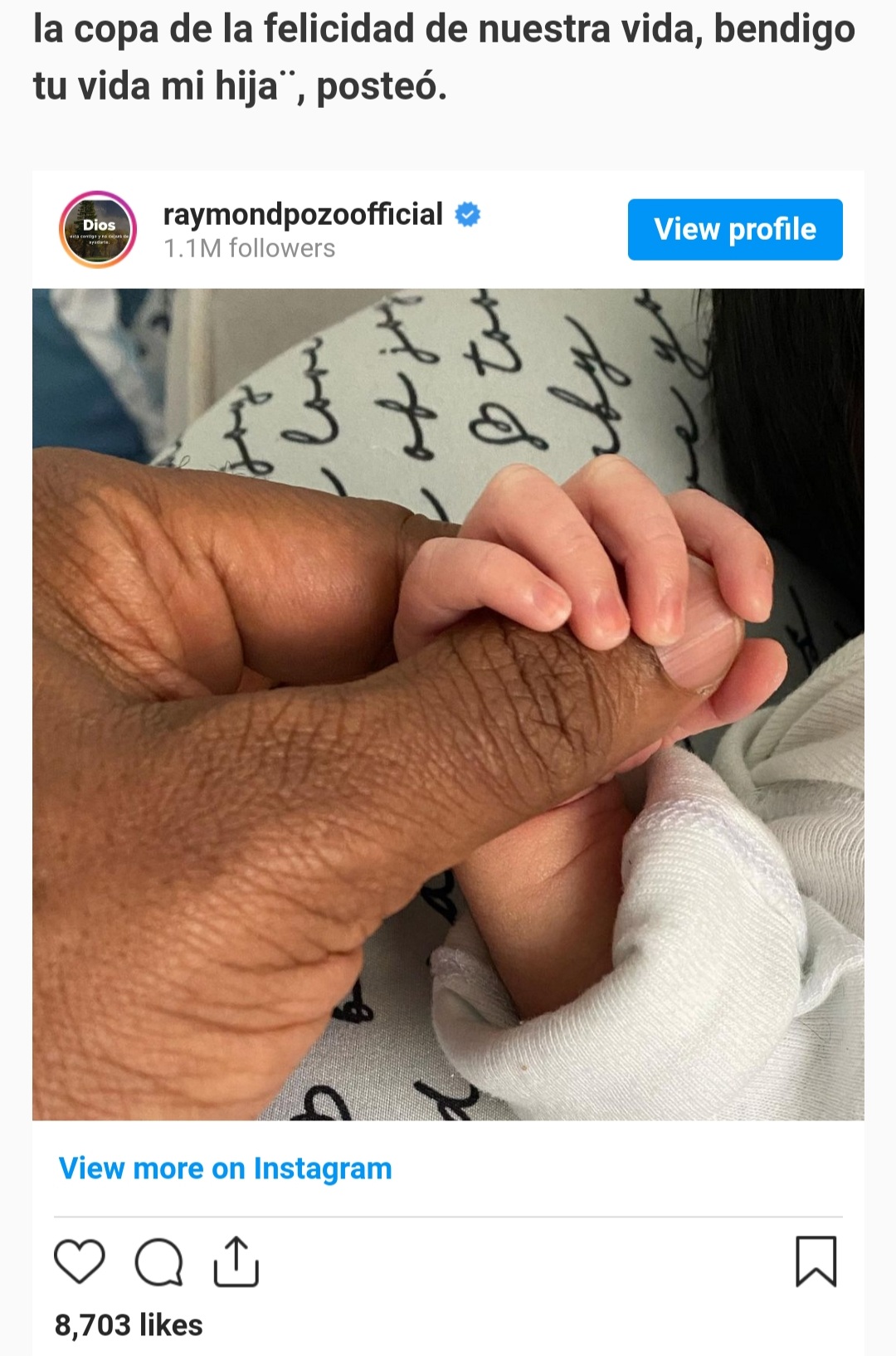 ¨Esta acción no se puede explicar con palabras, solo puedo decir gracias Dios fiel que cumple sus palabras, llegó Aarón Ray y rebozo la copa de la felicidad de nuestra vida, bendigo tu vida mi hija¨, posteó.